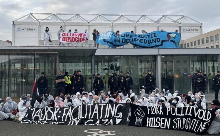 Letos februarja je v Københavnu potekal protestni tabor Cut ties with genocide, v sklopu katerega se je zgodila tudi zasedba sedeža danskega transportnega velikana Maersk. Multinacionalka Maersk je največje ladjarsko in logistično podjetje na svetu. Na prvi pogled morda izgleda kot še eno podjetje, ki samo »nedolžno« dostavlja stvari na vse konce sveta, a velikokrat imajo prav logistična podjetja najbolj umazane roke.