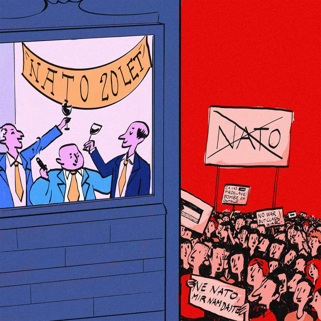 Natove vojske so vojske kapitalističnega razreda in ne branijo ljudskih množic. Oborožitvena gonja, vojno hujskaštvo, okoljska katastrofa, vojna v Ukrajini, genocid v Palestini, ki ga izraelske okupacijske sile izvajajo ob aktivni podpori Nata, so posledice kapitalizma, ki ga žene neskončni profitni motiv na račun družbenih potreb. Imperializem, ki je kapitalizem v svetovnem merilu, uničuje planet in življenja milijard delavnih ljudi po svetu.