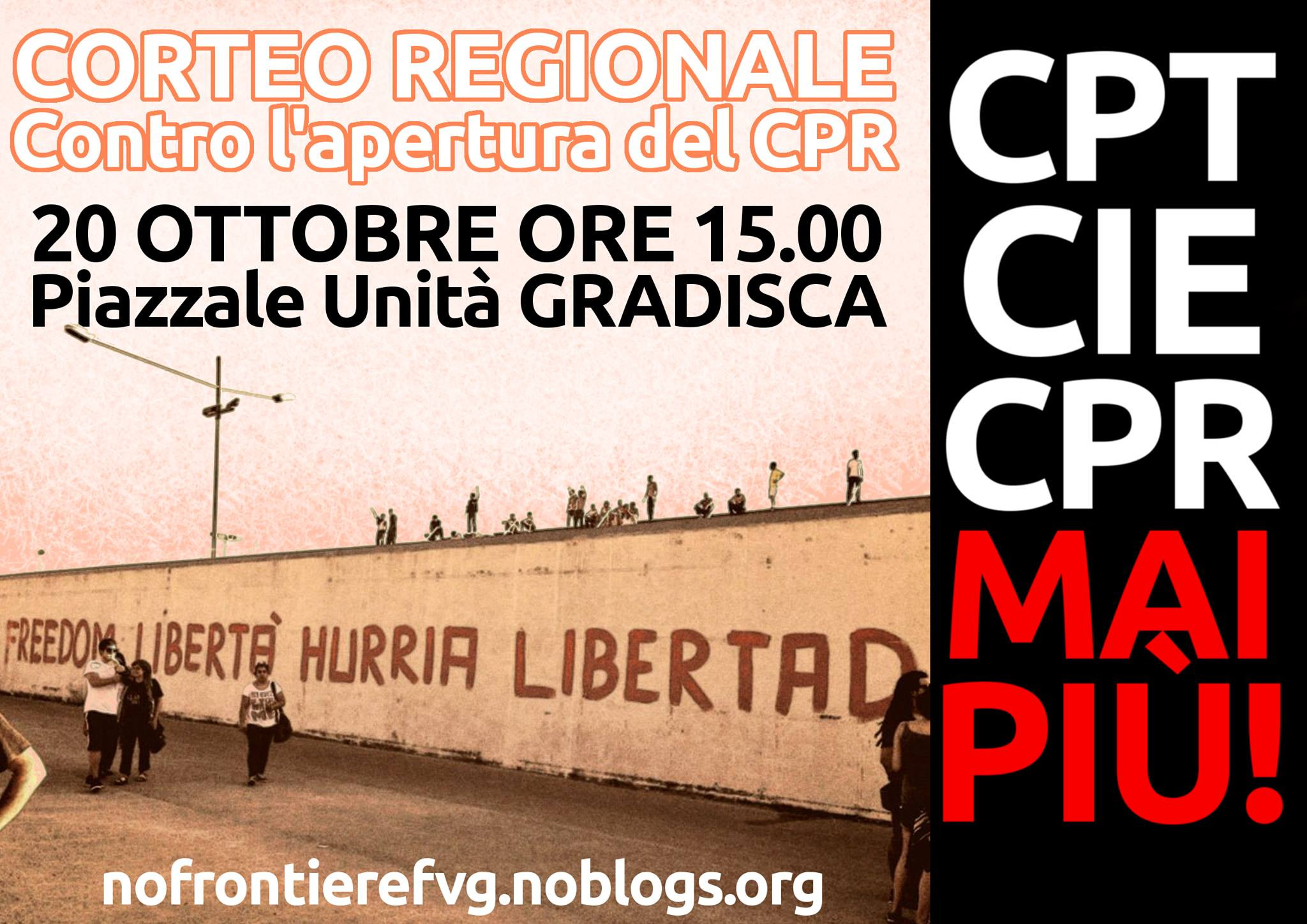 V soboto, 20. oktobra, bo v Gradišču ob Soči, nedaleč od slovenske meje, shod za pravice migrantov in proti novemu državnemu koncentracijskemu taborišču, imenovanemu CPR oziroma Centro di Permanenza e Rimpatrio, Nastanitveni center za deportacijo, ki ga oblast želi odpreti v začetku prihodnjega leta.