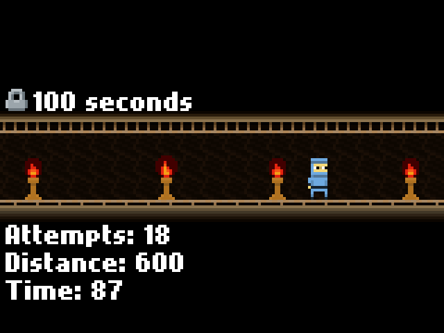 Špil izgleda zelo skromno. Ko ga poženeš, dobiš predse v pikslasti 2D grafiki izrisan level, ki je sestavljen iz ene same ravne platforme, štirih dekorativnih bakel in glavnega junaka - nindže, ki stoji na sredi. Naslov je vsaj malo zavajajoč. Možicelj resda prav hitro umre, če ga poskusiš premikati, a smrt ni kaznovana, temveč nagrajena: junak se instantno respawna in števec poskusov se poveča za ena. Oh yeah, ena točka! V zgornjem levem kotu vmesnika ždi skrivnostna ključavnica, ob kateri piše 5 atttempts, zato seveda moraš poskusiti, kaj se zgodi, če umreš petkrat. Spoiler alert - pojavi se še števec prehojene razdalje in ob ključavnici se izpiše novo navodilo za dosego naslednje prelomnice v igri. In tako do konca igre.