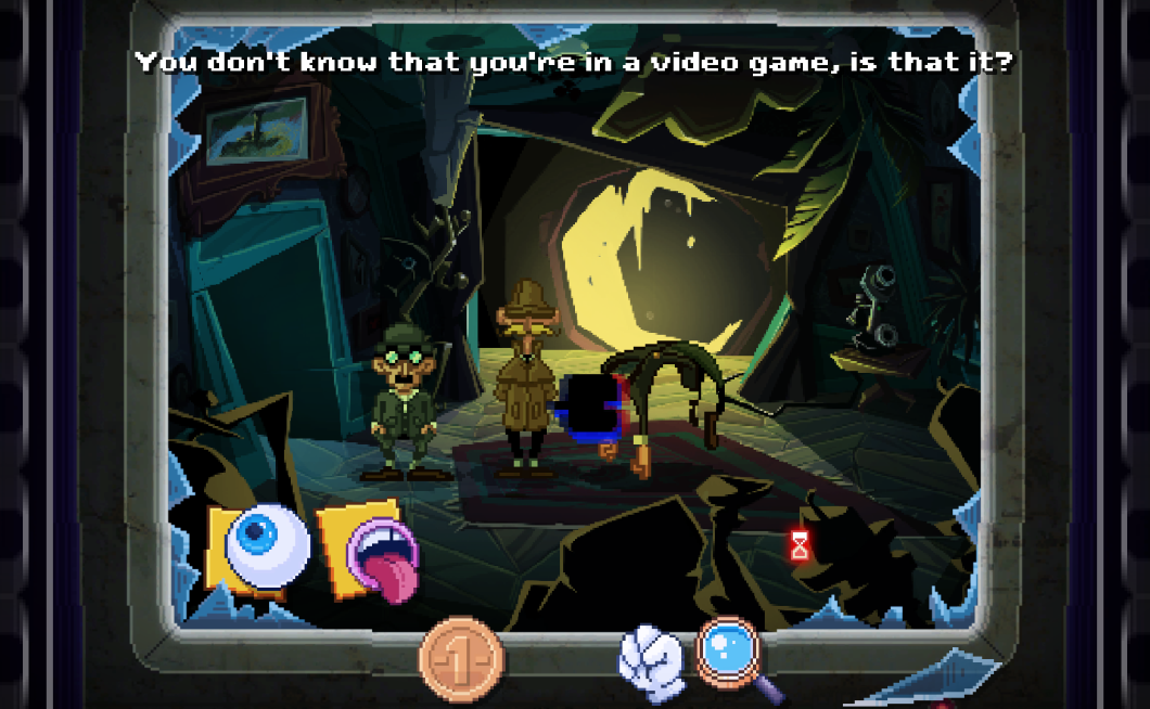 Najosnovnejši okvir igre predstavlja izvršljiva datoteka, v kateri nadzorujemo računalniški kazalec. Premike ves čas spremlja nadležni pripovedovalec, ki nas prepričuje, da program, v katerem smo se znašli, ni igra. Vse, kar naj bi torej storili, je stisnili ikono za izhod in program zapustili. Toda ali naj objestnemu komentatorju verjamemo? V njegovem glasu je vendarle razbrati kanček neiskrenosti. Kaj pa, če bi raje pritisnili gumb za igranje? Tega nam igra izmakne in nas zopet hitro usmeri na izstop. No, kot se je slavno izrazil Michael Jordan, stvar na tem mestu postane osebna. Prekleti knof za pogon zgodbe bomo pritisnili, pa naj stane, kar hoče.