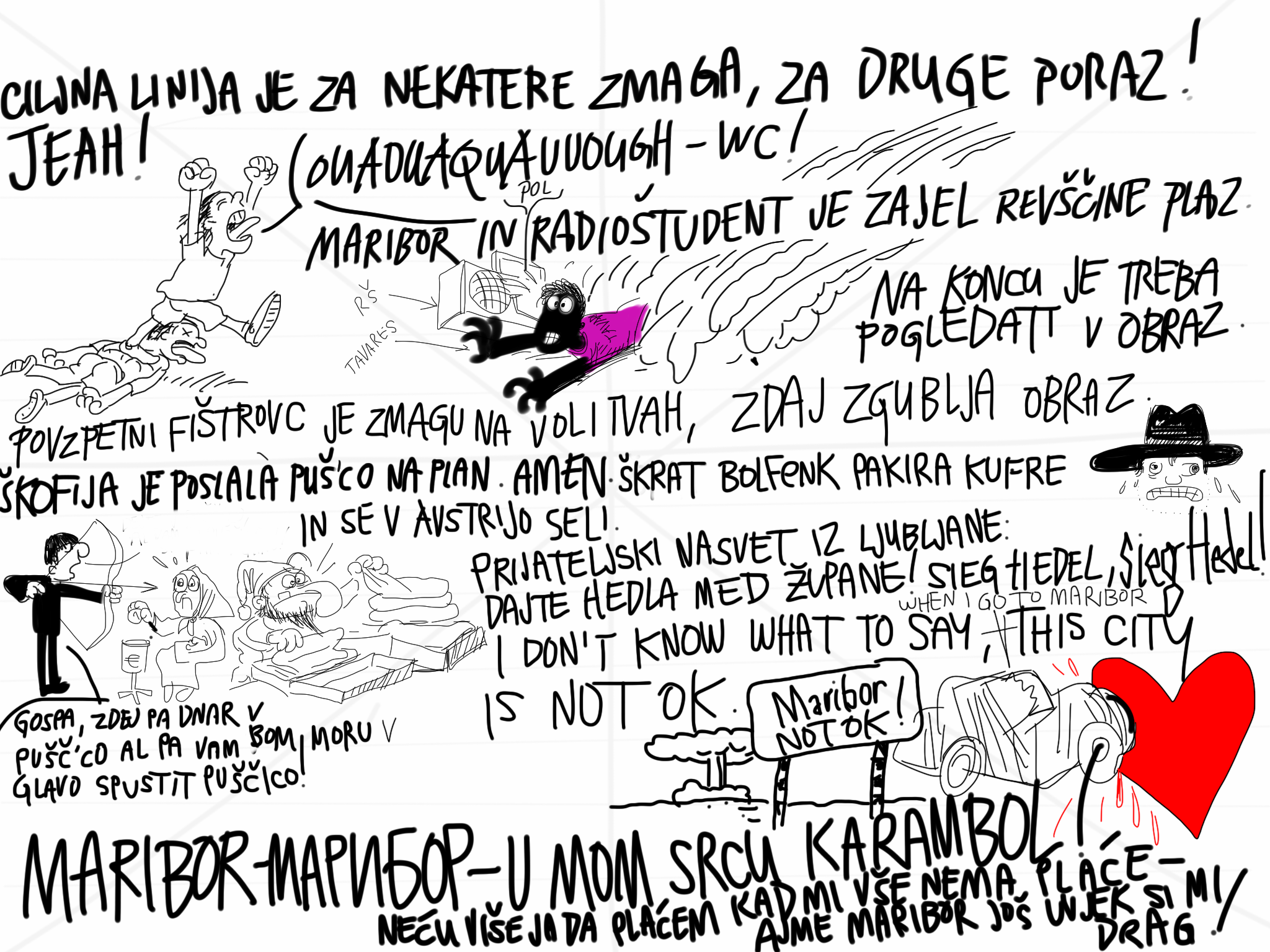Med tem, ko na tej strani Trojan siti predemo, kot mačke na soncu, Mariboru grozi, da bo praznike pričakal v temi, gol, bos in sestradan. Zaradi verjetnega bankrota MOM so ogroženi vrtci, šole, oskrba nemočnih ... Ogrožena je civilizirana prihodnost, s čimer ni šale, zato nocoj, 11.12.2014, na odru KUDa France Prešeren organizramo dobrodelni spektakel v podporo Mariboru, na katerem bomo po vaših željah in z vašo pomočjo skomponirali Pesem za Maribor. Že pred tem bo ob 19. otvoritev razstave izbranih Risank pretekle sezone in neprevzetih Risb a la carte, ki jih bomo po dobrodelnem Muzikalu ponudili na prav tako dobrodelni dražbi, katere izkupiček bomo namenili reševanju mariborskega proračuna. Risanko, ki jo bo v času Muzikala po vaših navodilh ustvarjal Dr. Horowitz, pa bomo podarili mestni občini Maribor. Kdor torej nima v prsih kamna namesto srca, bo nocoj v KUDu Franceta Prešerna. Pridite in donirajte. Vsi smo mi Maribor!