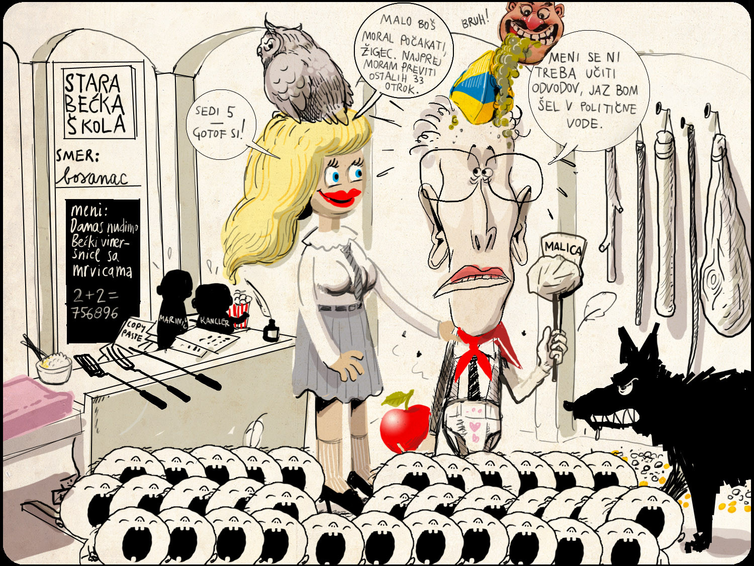 Superminister za suhe veje družbe Žiga Turk, se je lotil razkopavanja standardov in normativov v našem celotnem sistemu vzgoje in izobraževanja, češ da je povsem neučinkovit. Njegove besede: "Čeprav se je v preteklosti standard v našem šolstvu izboljševal, študije kažejo, da znajo otroci zdaj manj, ne več," so na laž postavili rezultati Mednarodne raziskave trendov znanja matematike in naravoslovja, TIMSS 2011, ki so pokazali, da naši osnovnošolci pri omenjenih znanjih v samem svetovnem vrhu. Glede na buče, ki jih superminister Žiga tako vztrajno kotali, je skrajni čas, da ga pošljemo še malo v šolo. A ne v državno, ker mu te niso všeč, pač pa jo bomo posebej zanj ustvarili v tokratni Risanki.