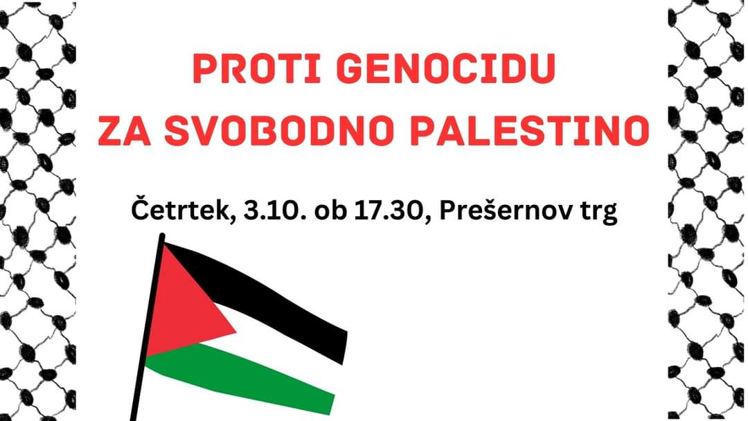 Vabljeni tudi na shod proti genocidu za svobodno Palestino, ki bo potekal v četrtek, 3. oktobra ob 17.30 na Prešernovem trgu.