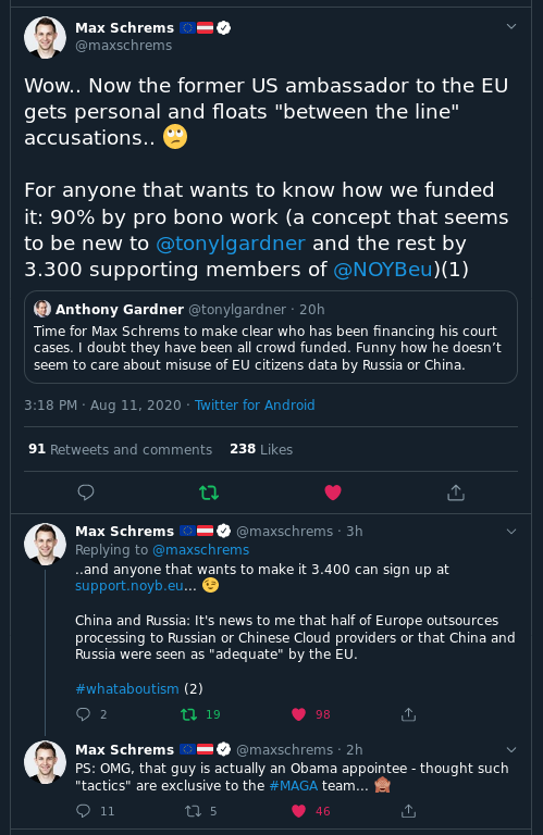 Po sedem let trajajoči obravnavi pritožbe Maxa Schremsa glede Facebookovega ravnanja z njegovimi podatki je Evropsko sodišče razsodilo, da Privacy Shield, dogovor o pretoku osebnih podatkov državljanov EU in Švice v Združene države, ni veljaven. Facebook in vrsta drugih internetnih korporacij tako nima pravne podlage za pošiljanje osebnih podatkov čez Atlantik pod drobnogled ameriških nadzornih agencij.