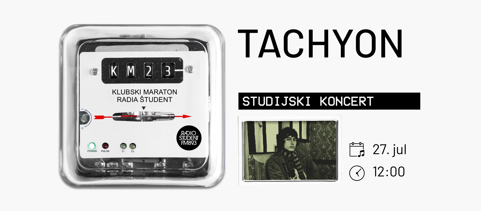 Studijske koncerte letošnjega Klubskega maratona Radia Študent bo odprl hipotetični elektroničar tachyon. V četrtek, 27. julija, ob 12. uri v živo iz studiev Radia Študent, v etru na 89,3 MHz in v živem videoprenosu!