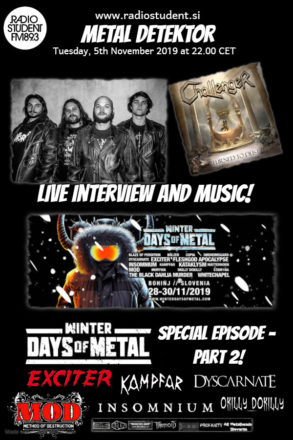 V tokratni ediciji Metal Detektorja se bomo prvih 30 minut osredotočili na domače heviće Challenger, ki bodo v petek, 8. 11. 2019, v klubu Gromka na Metelkovi predstavili svoj prvi EP Turned To Dust, ki je izšel prek založbe Dying Victims Productions. V studiu bomo gostili vokalista/kitarista Jakoba Rejca in kitarista Urbana Železnika.