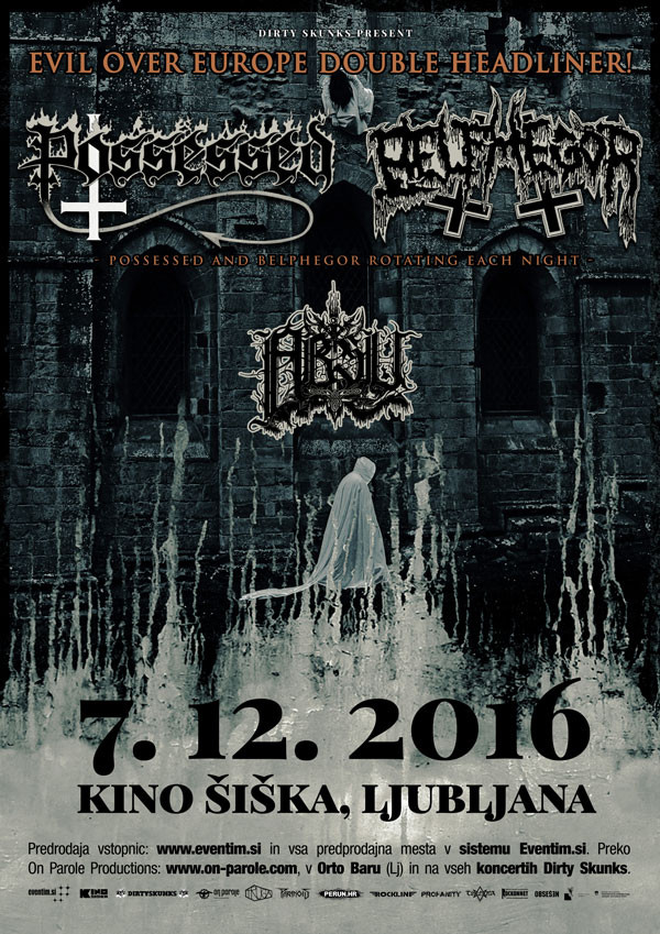 Na srečo smo kaj hitro pozabili na obstoj prvih dveh bendov, ko so oder zasedli Possessed, bend, ki ga še danes vodi vokalist in idejni vodja Jeff Becerra, ob njem pa glasbo legendarne zasedbe poustvarjajo predvsem člani zasedb Sadistic Intent in Coffin Texts. Poznavalci ekstremne scene vedo, da Possessed veljajo za očete death metala, saj so na nek način s svojo isto imenovano pesmijo, torej Death Metal, poimenovali žanr kot tak, pa tudi zvočno in tematsko nekako res ustrezajo pionirjem na tem področju, čeprav bi se tukaj dalo debatirati o tem, ali si to titulo očetov death metala res zaslužijo Possessed – ali pa Slayer. No, ta dilema ni bila pomembna ob dejstvu, da na velikem odru Kina Šiška gledamo kultno zasedbo, ki nas je ob malce slabši formi – v primerjavi z njihovim nastopom leta 2013 na festivalu Metaldays – popeljala skozi set klasik z albumov Seven Churches ter Gates Of Horror in seveda z EP-ja Beyond The Gates, poleg tega pa smo dobili tudi nov komad s še nedokončanega albuma, ki bo izšel nekoč v prihodnosti. Brez skrbi – je še vedno zelo Possessed. Bend se je izkazal z mogoče malo pomanjkljivo komunikacijo, vendar je to nadomestil z distribucijo res divje glasbe. Odlično! Za njimi je bila predolga pavza, na oder pa so stopili avstrijski death blekkerji Belphegor.