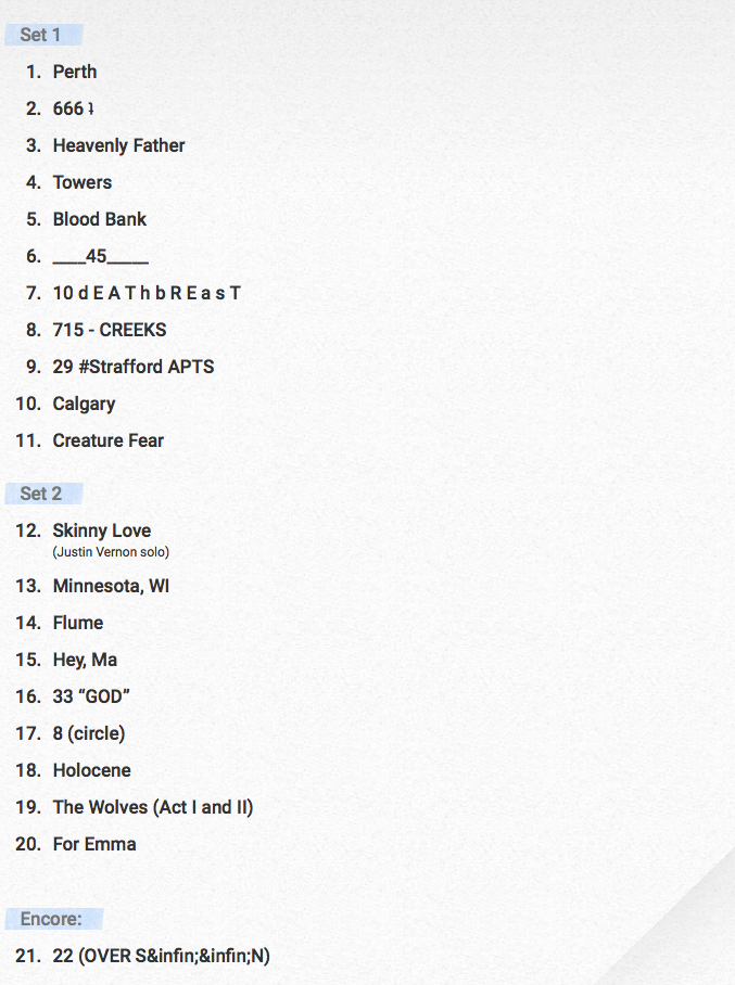 Pesem Towers se je, na primer, podala v bolj klasično americano kot na plošči. A cappella odlične Creeks je bila v živo še bolj brutalno efektirana, zaključek otvoritvene Perth pa še mogočnejši. Po drugi strani sta redosled sidrali izvedbi komadov Blood Bank in Skinny Love iz uvodnega poglavja Vernonove kariere. Interpretacija slednjega je bila skoraj povsem zvesta originalu, kot taka pa je enega najbolj idiosinkratičnih vokalov našega časa postavila na piedestal, ki si ga zasluži. Uspešno so parirali tudi ostali člani zasedbe, predvsem multiinstrumentalist Mike Lewis s svojimi ekskurzi na saksofonu. Novi pesmi, Hey Ma in Heavenly Father, sta znova obljubili, da se lahko prihajajoče plošče i,i, ki bo izšla 30. avgusta, res veselimo, saj se z njo obeta nov zvočni premik v karieri nemirnega glasbenika, ki se nenazadnje izven okvira svoje matične zasedbe redno preizkuša tudi v drugih sredinah. Dobro je koncert sprejelo tudi občinstvo, ki ga je tokrat treba izrecno pohvaliti, saj se je obnašalo nadvse civilizirano in izvajalcu namenilo praktično vso svojo pozornost.