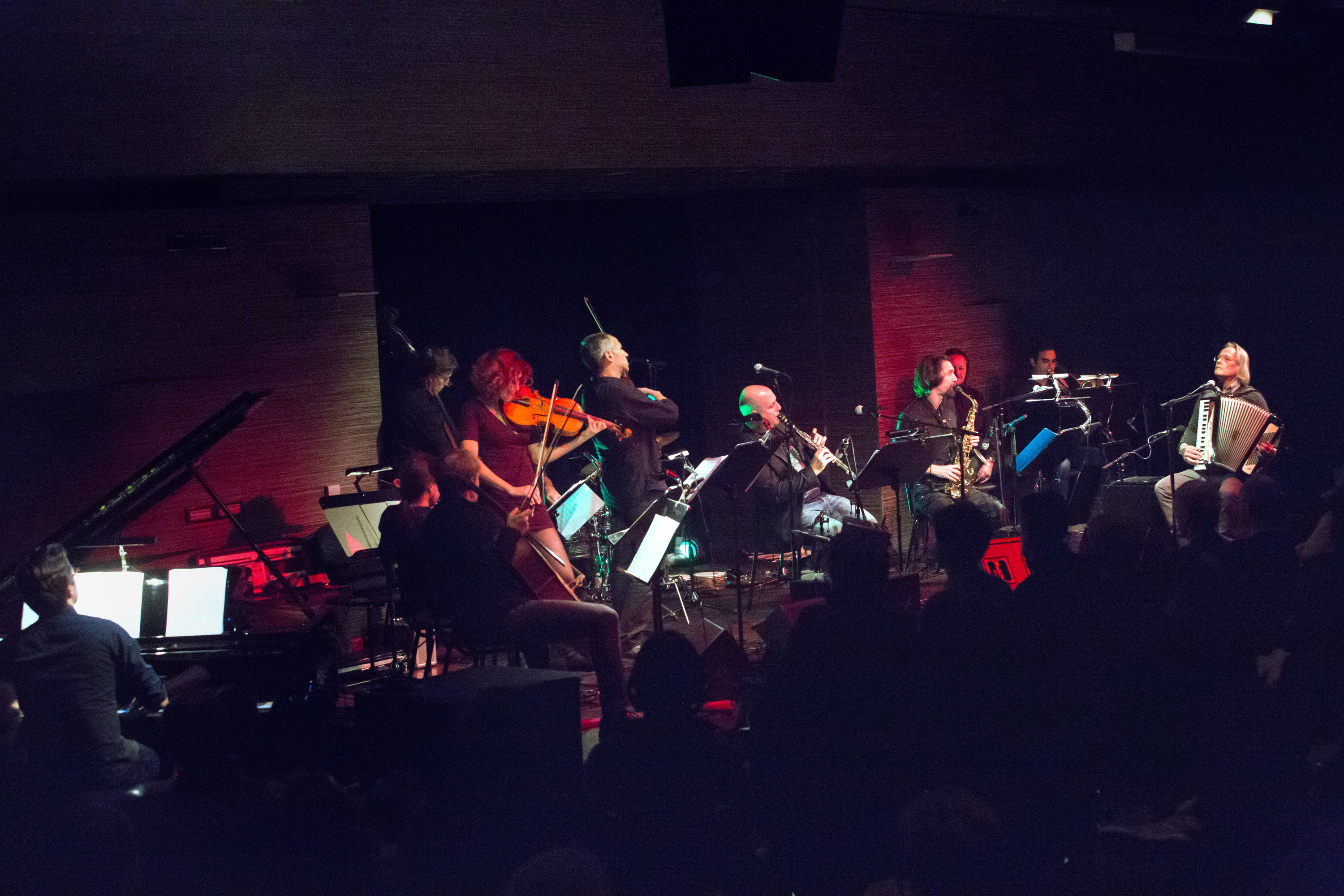 Vstopni fanfarovski ločen prihod celotne zasedbe iz vseh smeri je nakazal, da bo tokrat oder kluba skoraj premajhen za zbrani kolektiv. Postopno zasedanje lastnih odrskih mest je impulzivno narekovala ostinirana ritmična fraza Marjana Stanića na zvoncu, ki je služila kot vez med oglaševanjem in nameščanjem v uvodno skladbo Encore un W. Ta nas je popeljala v tipični Bibičev zvočni svet, kjer se prepletajo tradicija zahodne klasične glasbe in melosi različnih ljudskih napevov. Vse skupaj pa harmonikaš in skladatelj zapakira v sodobne jazz – rock suite, ki presegajo vsakršne žanrske kvalifikacije. Če nas je omenjena skladba popeljala v daljno zvočnost renesančnega polifonega plesa, nas je sledeča Memoires du soldat zapeljala v sodobno kruto introspektivno doživetje. Skladbo je zagnalo čutno, najprej enoglasno in nato počasno stopnjevanje dvoglasnega in kasneje večglasnega tipkanja po klavirju izpod prstov Saše Vollmaierja. Njemu so se kasneje v ternarnem metrumu variacijsko nalagali ostali instrumenti, dokler ni vse skupaj prosto po Bibičevo razpadlo na prafaktorje in se ponovno sestavilo v začetno temo in igrivo spevnost. Podobna forma, pod taktirko Bibiča, ki je potihoma narekoval potek skladb, je nekako prežemala celotni koncertni spored in nas neprestano vabila k navihanemu poslušanju zvočnih čudes.