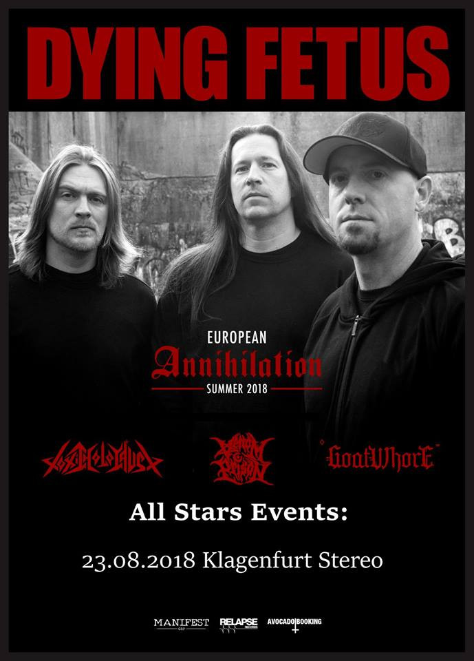 Ob poplavi poletnih festivalov je dobro tudi to, kako se včasih kakšni bendi med potjo z enega na drugo masivno glasbeno srečanje ustavijo tudi v kakšnem klubu. Tam si jih lahko ogledate v intimnem vzdušju, kjer si izkušnjo z vami deli maksimalno 200 in ne minimalno 2000 ljudi. Takšno izkušnjo smo doživeli v četrtek 22. avgusta v Celovcu. Tam so se namreč dobili trije ameriški bendi – brutalni death metalci Dying Fetus, toksični thrash metalci Toxic Holocaust in blasfemični death black metalci Goatwhore. Glasbeni dogodek se je zgodil v klubu Stereo, nedaleč od sedeža Mohorjeve družbe.