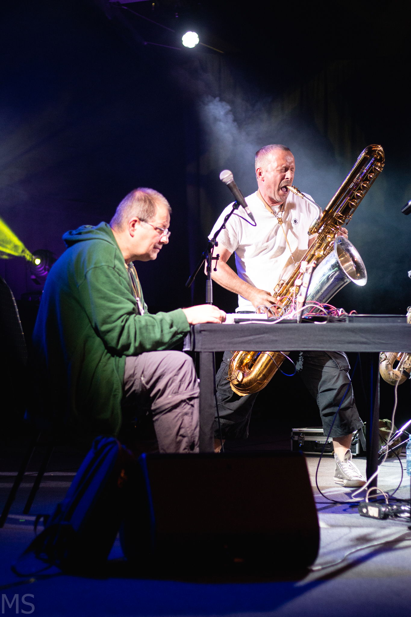 Za obetavnim četvercem, ki ima še veliko prostora za odkrivanje novih zvočnih perspektiv, sta se zvrstila še dva elektrofonična izvajalca, ki sta volumensko prodornost še krepko zvišala. Prvi od omenjenih je tandem Falling, v katerem sta se povezala mojstra Mats Gustafsson na slidovskem in baritonskem saksofonu, flavti, elektroniki in klaviaturah ter Christof Kurzmann na elektroniki ter s poezijo. Ustvarjalca na videz delujeta kot nasprotji – prvi zatopljen in poplesavajoč, drugi sedeč in osredotočen. A oba sta zvočno enakovredno intenzivna. Zaključek večera pa je pripadel triu Mopcut, v katerem delujejo vokalistka Audrey Chen, kitarist Julien Desprez in bobnar Lukas König. Če nas je tandem Gustafsson-Kurzmann že dodobra presenetil in nas pripravil na elektrofonično katarzo, so bili trio Falling katarza sama. Terapevtska destrukcija v obliki nojza, improvizacije in elektronike, ki se je do konca večera stopnjevala z Audreyjino razsežno vokalno ekspresijo.