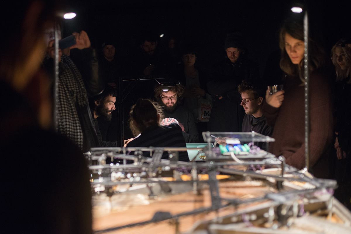 S sprehodom čez preprosto, a vizualno učinkovito in prefinjeno prirejen prostor lahko torej razumemo vse te tehnične elemente koncepta projekta Partíja, imamo pa tudi možnost, da igro preizkusimo še sami. Takrat se zgodi ključen preskok med umetniško glasbeno instalacijo in, recimo temu, participatorno prakso. Če lahko z vidika zunanjega slušatelja zadevo analiziramo z določene nevtralne distance, včasih nasedemo glasbenemu suspenzu in nas kak dramatičen preskok v zvoku preseneti, pa nam vse skupaj postane veliko bolj jasno, ko se usedemo za igralno mizo. V nekakšnem badass kazinojskem duhu nam je ponujen viski in lahko se potopimo v igro. V praksi stvar večinoma sicer ne deluje tako dramatično, saj je za mizo veliko govora o pravilih, pa o ilustracijah na kartah, njihovi debelini in teži, izvedbi tiska ... a na tem mestu vstopi tudi prav posebne vrste dinamika med tem, da igralci pozabijo na dejstvo, da producirajo zvok oziroma igro pač zgolj igrajo, in tem, da določena karta, ki pade, proizvede zvok, ki ga igralci zaznajo in so nanj na nek način precej ponosni ali pa (sicer redkeje) tudi razočarani. Če je bila igra na začetku osnovana kot set navodil za improvizacijo in so bili igralci precej bolj muzikalni v tem, kar so počeli, in skratka toliko bolj zavestni, sta se Brgs in Stupica z namensko odločitvijo za igro, v kateri ti takšno zavest poskusita odvzeti, zadevo definitivno spustila v milje nezavednih procesov ustvarjanja glasbe oziroma zvočnosti. Hkrati pa se kot aktivni člen v procesu generiranja zvočnosti v prostoru težko popolnoma distanciraš, saj se s táko neposredno vpletenostjo v igro in neposredno bližino klavirja ne moreš izogniti temu, da bi prisluhnil rezultatu lastnih potez in ostalih igralcev. S tega vidika bi bil potreben eksperiment: postaviti igralce v ločen prostor in jih tako popolnoma distancirati od zvoka, slušateljstvo pa bi prav tako ne imelo uvida v igro in bi jih zvok lahko pristneje presenečal. S to distanco bi morda lažje tudi bolj kritično pristopili k zvočnemu produktu in ga lažje vrednotili. Približali bi se polju generativne glasbe, terminu, ki ga je Brian Eno skoval, da bi opisal vedno spreminjajočo se glasbo, ki jo generira določen sistem. Koncepta Partíje sicer ne moremo opisati s točno tem pojmom, a z ločitvijo tistega, ki zvok povzroča, in slušatelja bi se pravzaprav poigrali z izenačevanjem človeka in stroja, orodja, ki glasbo generira.