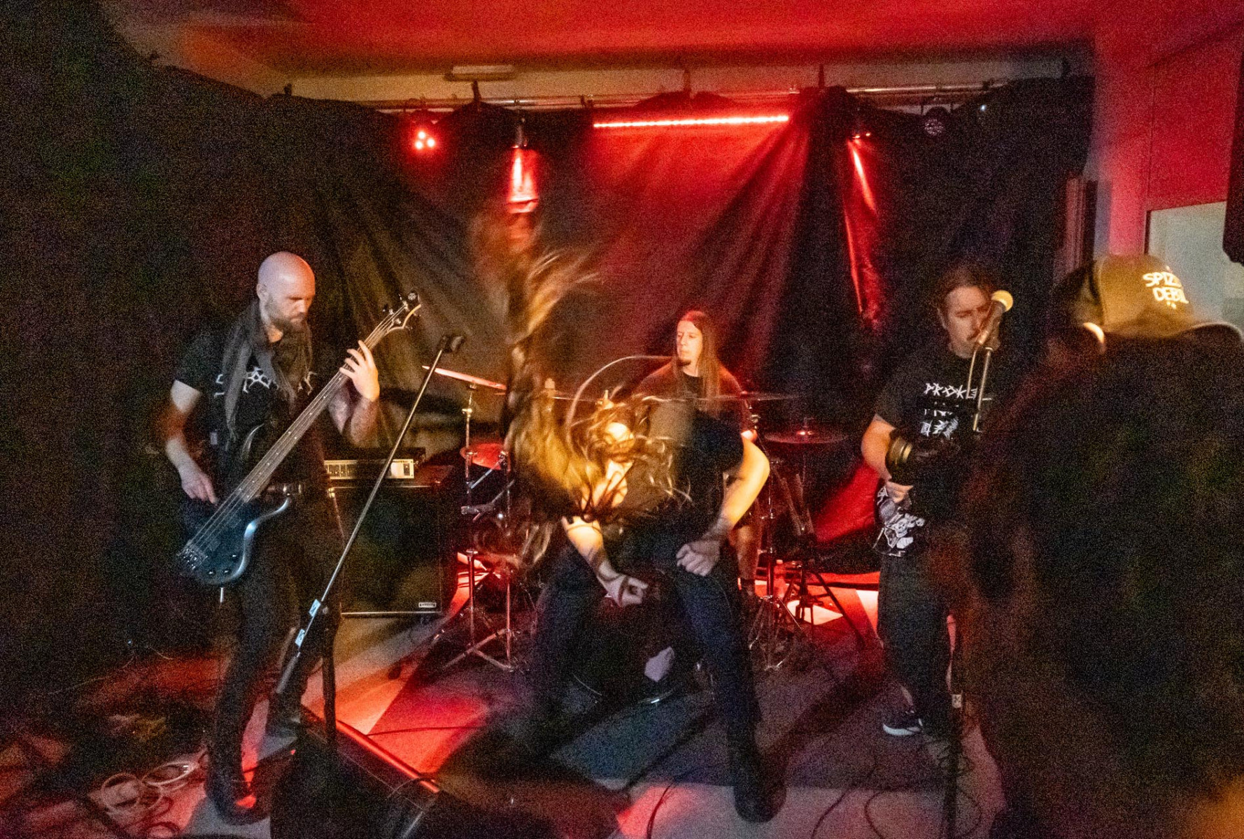 Drugi so bili na vrsti Degress. Potožili so, da bi se res radi otresli oznake crusterjev, ker gre za tri sceni dobro poznane metalske mačke. Kitaro upravlja Lev Calvitum, bas Ravbar Commando, bobne in vokal pa Veprous. Tudi Degress so izkazali uigranost. Odšpilali so celo plato Mitraljezus, ki jo preigravajo že leto in pol. Bobnar in vokalist je med komadi nagovarjal publiko ter zbijal šale in zasedbo vsakič predstavil kot drug bend, seveda z lokalnimi forami, pri čemer je bilo lepo videti intimno povezavo med nastopajočimi in obiskovalci. S šalami se je tudi opravičeval, ker so mu palčke nenehno letele iz rok. Nastopijo pač tudi takšni dnevi. Zmotilo nas je le, da je bil bas preglasen, ker tako kitara ni prišla do izraza, a smo vseeno lahko uživali v starošolskem black metalu.