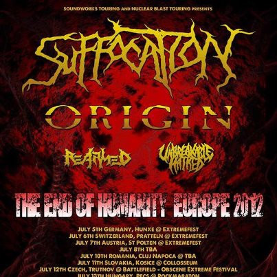 Večer 8. julija 2012 je v Gala Halo na Metelkovi pripeljal eno najbolj brutalnih letošnjih turnejskih karavan, ki trenutno potuje po Evropi pod imenom The End Of Humanity 2012. Zadeva šteje dobre 4 zasedbe, a ključni sta glavni dve – Suffocation in Origin, obe iz Združenih držav Amerike.