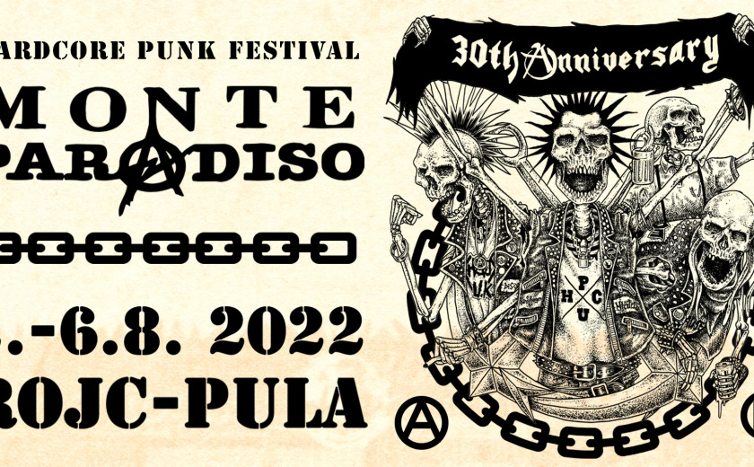(sobota) 6. 8. Pula, Rojc – 30. Monte Paradiso Festival: Agregat (slo), Bronze (srb), Bait (e), Statico (srb), Scheisse minelli (d), Asocial (swe).