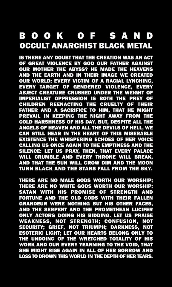 Book Of Sand je vrh ledene gore, najaktualnejši artefakt okultne anarhistične propagande pa ambivalentna in presenetljiva vstopna točka. Govorimo o posebnem in na nas čakajočem underground solo projektu, ki se je tekom svoje nekajletne diskretne eksistence dotaknil marsikaterega poganjka širjave black metalskih ekspresivno-spiritualnih, izkustveno-mišljenjskih ter poizvedovalskih modusov. V striktnejšem scenskem in klasifikatorskem smislu pa imamo pri severnoameriških Book Of Sand opravka s tistim bolj avantgardnim, kompozicijsko zvedavim ter idiosinkratičnim spektrom aktualnega black pogorišča,zaradi anarha-feministične, anti-rasistične in anti-speciesistične opredeljenosti pa je do nas pripotoval tudi prek kanalov t.i. R.A.B.M.-ja oziroma Red and Anarchist Black Metala. A kaj to pove o pričujoči izkušnji? Niti ne kaj dosti, saj posebnost Book Of Sand potuje v obe smeri, ki seveda nista edini možni, a vseeno.