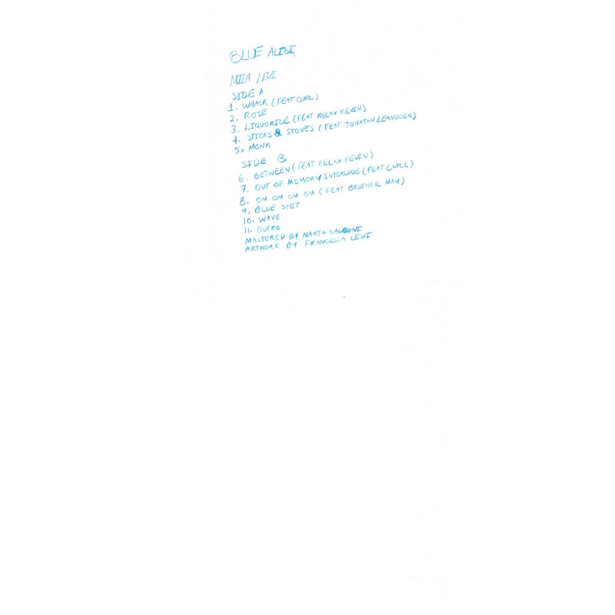Levi in gostje nam na albumu Blue Alibi predstavijo prepričljiv glasbeni izdelek s pravo mero raznolikosti v žanrskem smislu, hkrati pa z emocionalno in tematsko povezanostjo, ki zaznamuje ves projekt. V uvodnem komadu Whack gostuje kolektiv CURL, torej Sey in May, ki skupaj z disonantnim brenkanjem na kitaro Levi ustvarja občutke kolektivne norosti. Potem vokali potihnejo in slišimo le še kitaro in odmevajoče sinte, ki nam zapolnijo useša. Zatem slišimo prvo od mnogih balad, Rose, v kateri se kitara v efektu odmevajoče spaja z vokalom LeviV nadaljevanju se zvrstijo še balade Liquorice z eksperimentalno glasbenico Relax KevinSticks and Stones, v kateri se s svojim lastnim imenom pojavi traper Yung Leankomad Wave in nazadnje še Om om om om z melanholično vzvišeno poezijo Brotherja Maya. Komadi, kot sta Monk in Blue Shit, se vedejo kot bolj ambientalni ter introspektivni deli albuma. Ponujajo nam čas za refleksijo o prejšnjih baladah, pa tudi o dveh vmesnih komadih, uvodnem ter srednjem, ki je ustrezno poimenovan Betweenv njem pa ponovno gostuje Relax Kevin. Iz komada naredi z Levi najprej plunderfonično norišnico dveh vokalov, v drugem delu pa nas še pošteno prestraši s počasnim industrialnim razbijanjem. Outro nas po končni ravnini zapelje s shoegazerskim riffom.