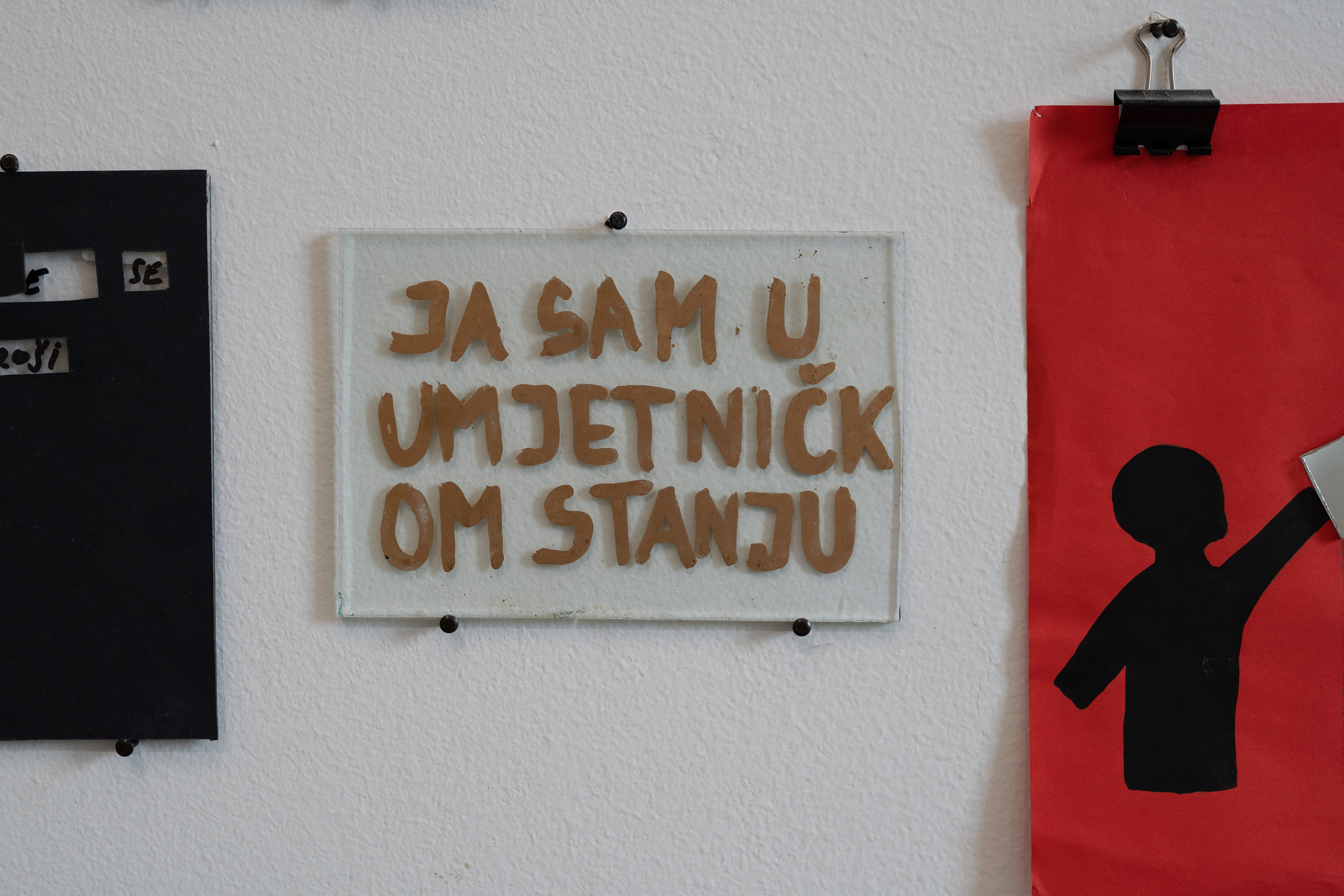 Zlate črke na steklu: JAZ SEM V UMETNIŠKEM STANJU.