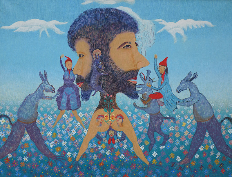 Dva obraza z igličasto brado porasle glave. Od vratu navzdol se preoblikujeta v simetrično polimorfno spolovilo, poslikano s folkloristično-cvetličnimi ornamenti. Okoli zraščene figure na cvetočem travniku plešejo živalsko-človeške prikazni. Medtem se beli kopasti oblački povezujejo v antropomorfne podobe ptic, ki se spuščajo nad rajanje. Druga slika: po vseh štirih plazeči se Adam v igličastem grmičevju raja, z vznemirjenjem zre proti drevesu. Na horizontu v meglici skozi gole veje drevesa preseva oddaljeno sonce, ki spominja na rezino limone. Tretja slika: tri zlovešče, smejoče se moške figure igrajo na atomske inštrumente, medtem ko v ozadju gori drevje in se rušijo zidovi. Dim se spreminja v kosme razpršenih oblakov, majhni čovječuljci bežijo v vse smeri. Ob pogledu na svirajoče debeluhe se obrača želodec.