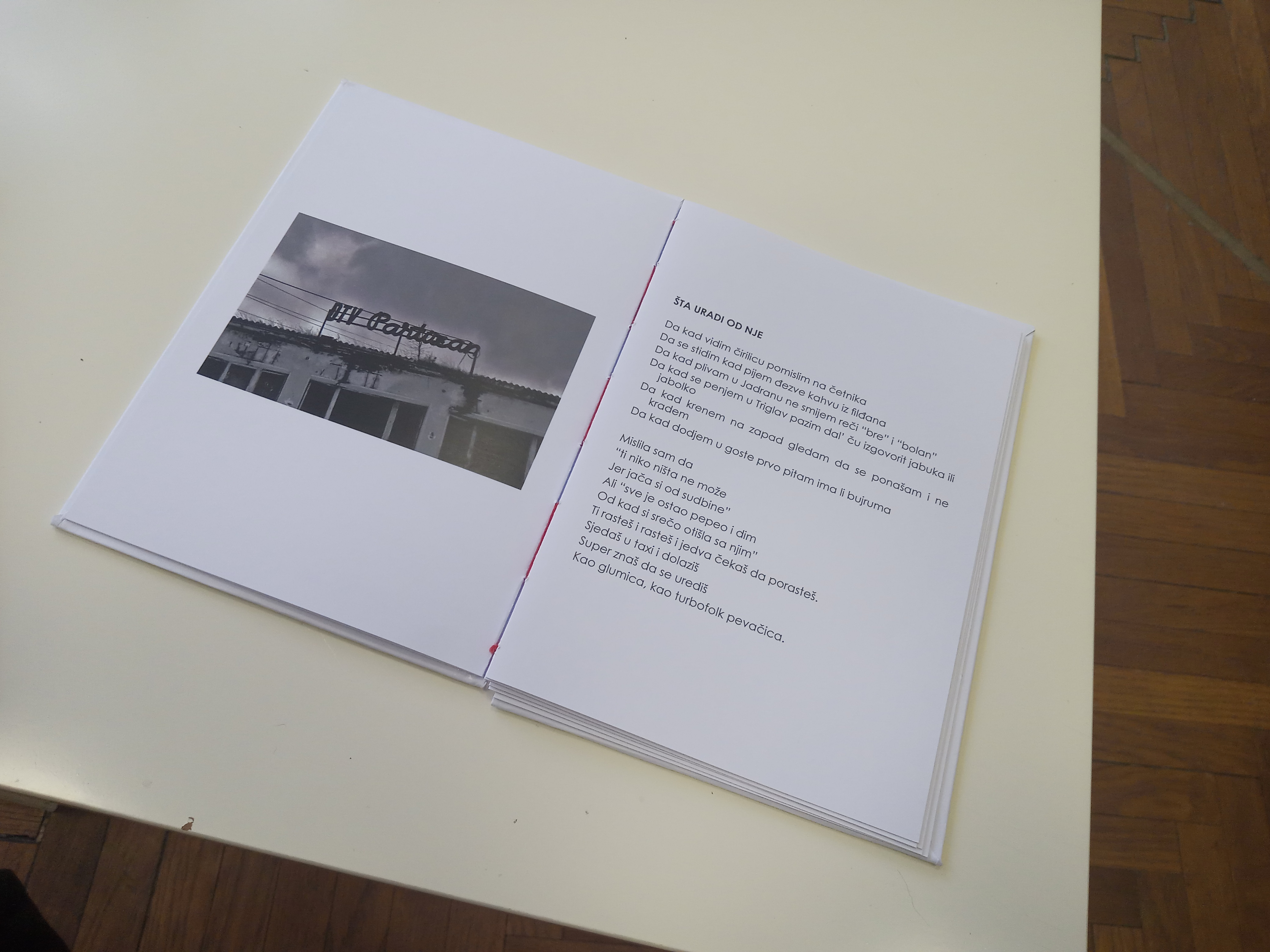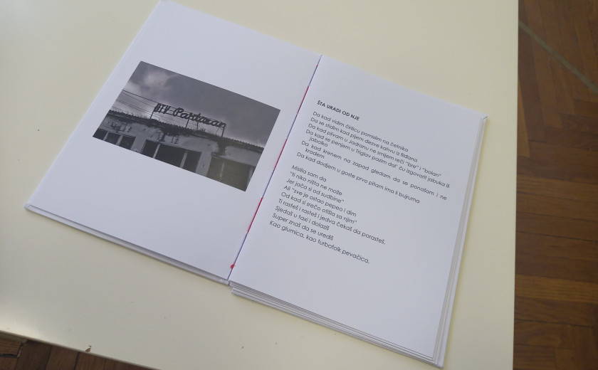 Knjigo umetnice, prav tako kot video, sestavlja nabor fotografij iz avtoričinega osebnega arhiva ter pesmi v bosanskem in angleškem jeziku. Majhna bela knjižica leži na mizi z enim samim stolom sredi prostora. Ko jo primemo v roke, se nam zdi, da držimo nekaj skrajno krhkega, saj so strani ročno vezane zgolj z ohlapno rdečo nitjo. Moramo paziti, da ne bodo zapele sirene za to drobno papirnato telesce.