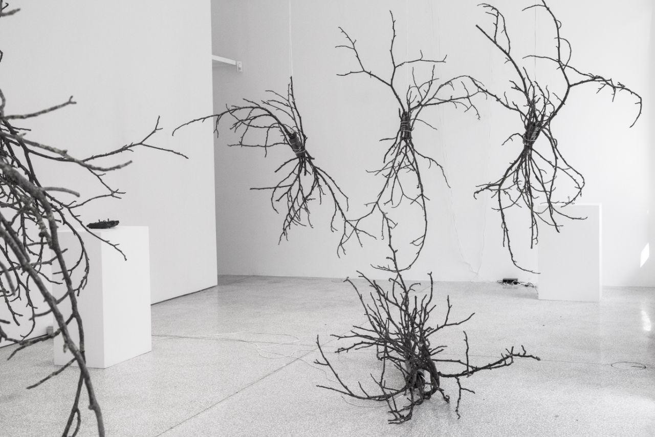 Na samostojni razstavi (Ne)vidna krajina, ki je bila na ogled med 15. septembrom in 8. oktobrom, je Nika Erjavec, absolventka magistrskega študija kiparstva, predstavila novo postavitev, ki sodi v cikel del, nastalih tekom podiplomskega raziskovalnega procesa, s katerimi izpostavlja senzorične zaznave onkraj vizualnih. Za umetniško raziskavo in serijo instalacij /ne/vidno je sicer v letu 2019 prejela študentsko Prešernovo nagrado. Jedro njenih ateljejskih eksperimentov, pa tudi teoretskih raziskav je zvok, predvsem njegova telesnost in materialnost. Ti dve lastnosti se manifestirata v prostoru in obdajajoči ga materiji, ki zvok obenem tudi omogočata in ga sooblikujeta. Erjavec zanimajo parametri, kot so snov, oblika, pozicija ter relacija objektov, ki ključno vplivajo na proizvajanje zvoka in njegovo zaznavo. Zgoščenina njenega zanimanja so točke stika med fizičnimi objekti, pa tudi tiste, ki se pojavijo v odnosu med objektom in subjektom.