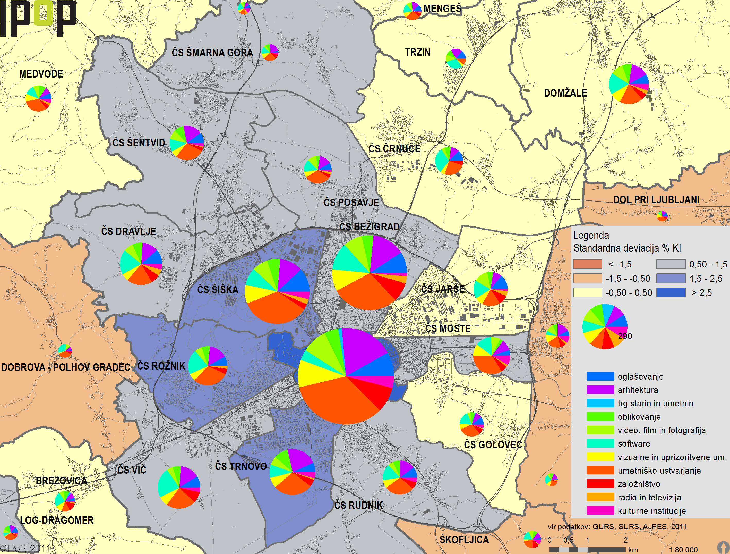 Inštitut za politike prostora je raziskavo o potencialih kreativnih industrij, ki naj bi v mestu generirale vsebine za njegov razvoj, naredil leta 2011 po naročilu Regionalne razvojne agencije LUR, in sicer v sklopu evropsko financiranega projekta Creative Cities. Vanjo so na podlagi nekaterih aktualnih teorij, med katerimi sta v ospredju teza o kreativnem mestu Charlesa Landryja in kreativnem razredu Richarda Floride, zajeli več podjetij in organizacij. Med kreativce so na podlagi združevanja več pristopov vključili dejavnosti iz vseh vetrov, saj so v svojo klasifikacijo zajeli oglaševanje, arhitekturo, prodajo umetnin in starin, oblikovanje, video, film in fotografijo, programiranje, vizualne in scenske umetnosti ter glasbo, umetniško ustvarjanje, založništvo, radijsko in TV dejavnost ter kulturne ustanove. Njihovo lokacijo in dejavnost so preverjali na podlagi podatkov Agencije Republike Slovenije za javnopravne evidence in storitve, krajše AJPES, kjer so v Ljubljani v teh dejavnostih našteli več kot 6.000 tovrstnih registriranih organizacij. Nato so prek ankete, na katero je odgovorilo 186 vprašanih, preverjali skladnost podatkov iz AJPES-a.