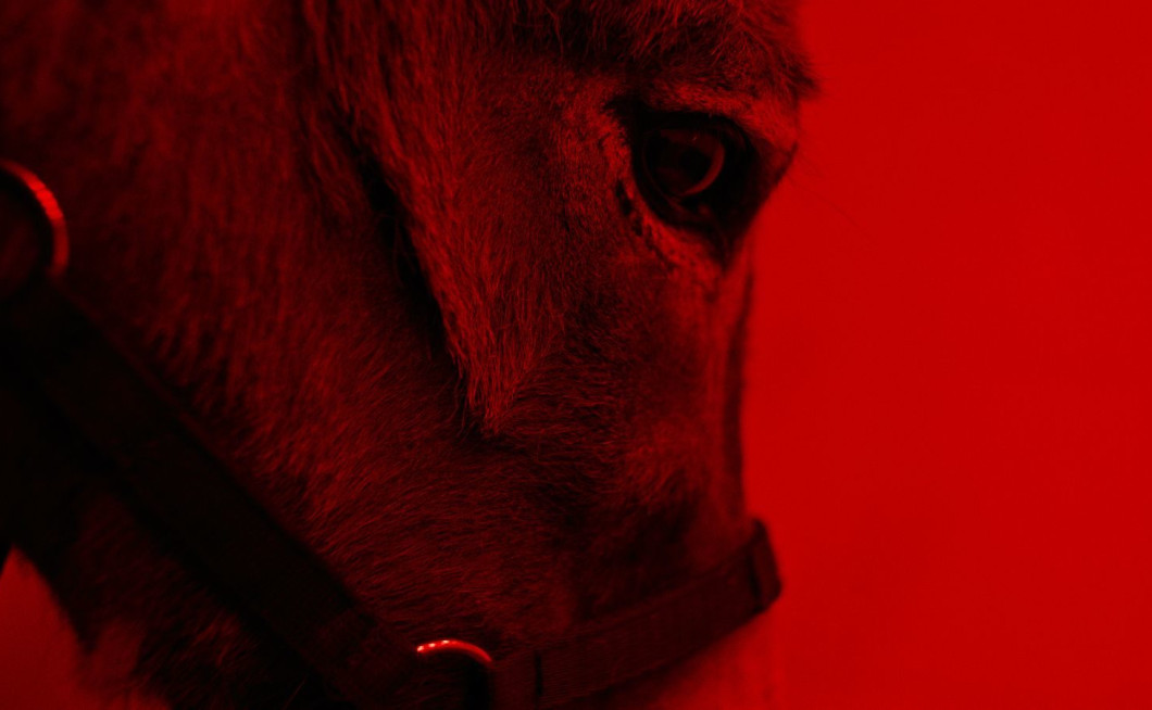Ia svojo pot začne kot cirkuška žival. Prvič ga vidimo, ko v soju utripajočih rdečih luči umre in oživi za občinstvo v areni. Utripajoča rdeča svetloba se kot lajtmotiv kasneje nediegetsko pojavlja, kadar je Ia posebno prestrašen in dezorientiran. Dodatno nas v njegovo kožo postavijo subjektivni kadri oslovega pogleda, ki je mestoma zožan v tunelski vid. Film nam s kadriranjem in filmskim jezikom nasploh tako skuša približati oslovo doživljanje sveta.