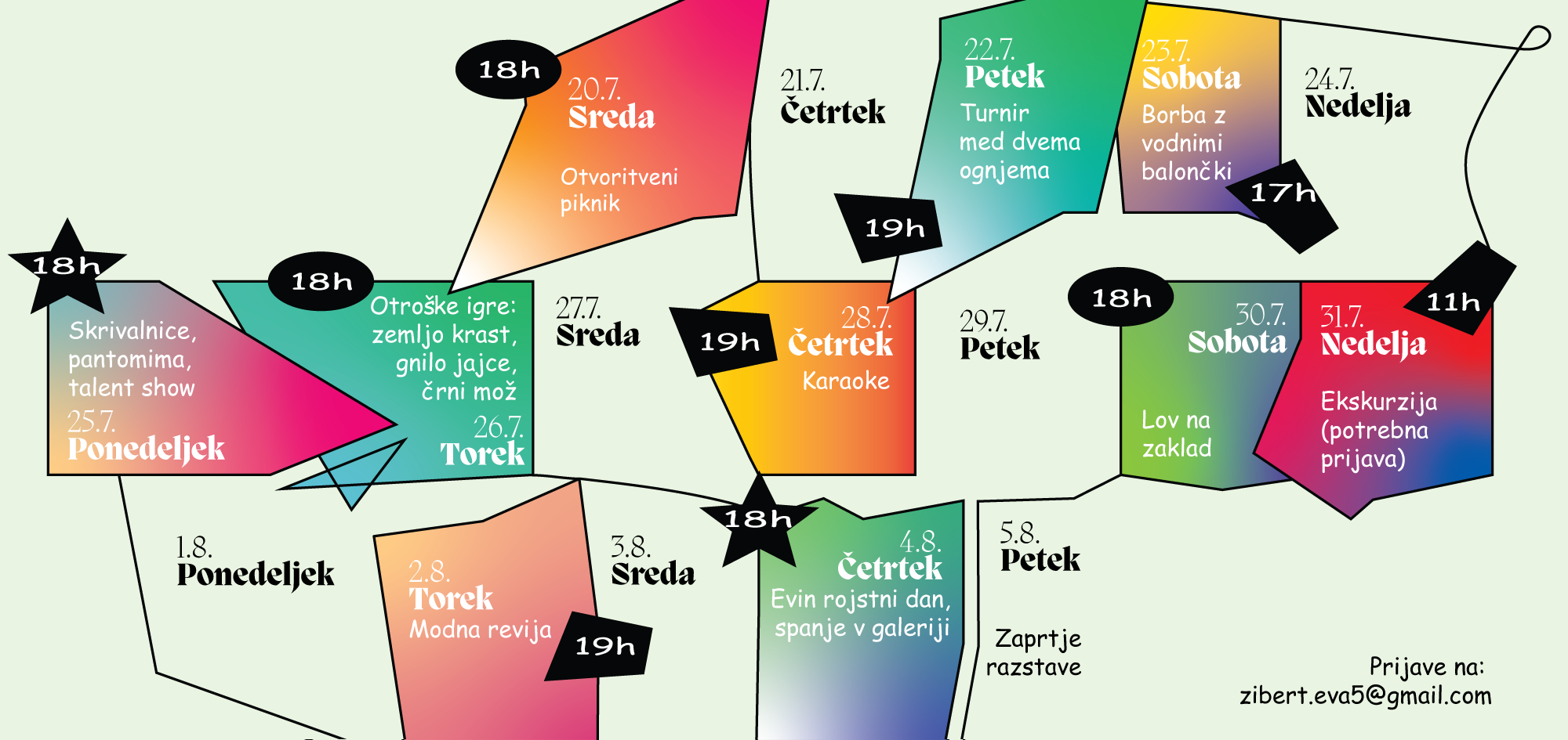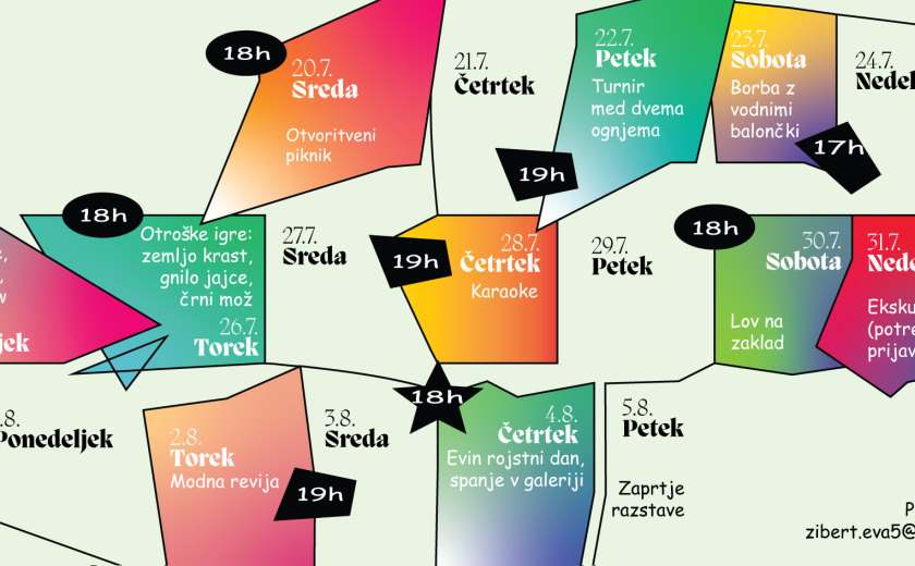 Danes zvečer ob šestih se bo v Galeriji DLUL igralo zemljo krast, gnilo jajce in kdo se boji črnega moža. V četrtek so obiskovalci vabljeni, da preizkusijo svoje pevske sposobnosti na karaokah. V soboto sledi lov na zaklad, v nedeljo pa ekskurzija. V naslednjem tednu pa se bosta kot zadnja dogodka odvila modna revija in praznovanje kuratorkinega rojstnega dne ter sleepover v galeriji.