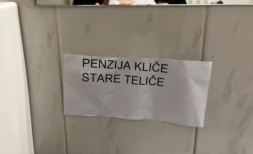 Da stvar predstavimo bolj plastično: na straniščih akademije so se pojavili listki z napisom »penzija kliče stare teliče«. Sogovornica sama pri tej akciji ni sodelovala, a je od ostalih slišala, da s tem študentje niso želeli le nasloviti zastarelosti pedagoških procesov nekaterih profesorjev, ampak tudi izraziti nezadovoljstvo z odnosi med profesorji in študenti kot tudi med zaposlenimi nasploh. Do zaključnih razstav se akademija na študentsko akcijo ni odzvala.