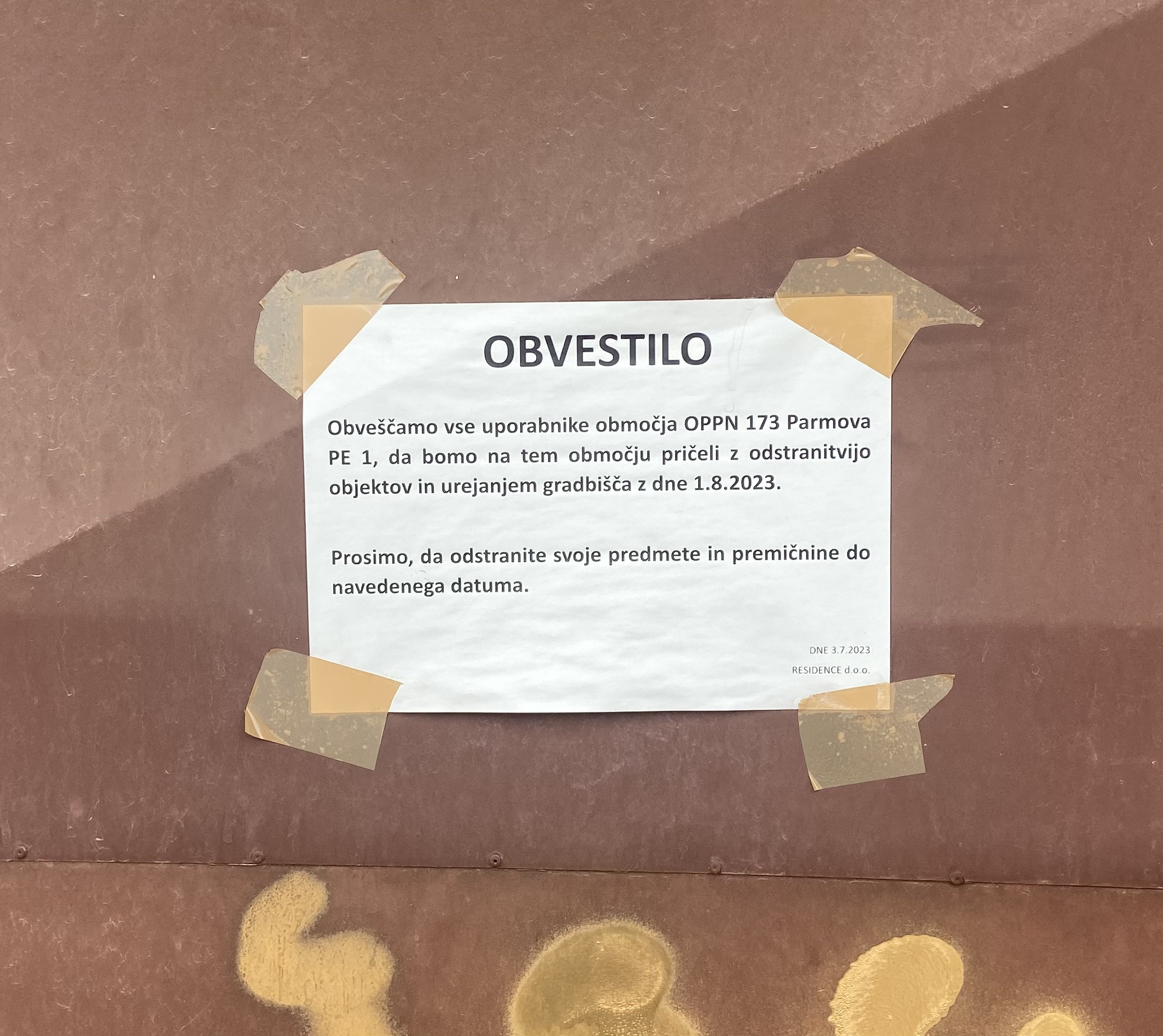 Uporabnike prostorov ob Parmovi in Kurilniški ulici je 13. julija pričakalo obvestilo o pričetku rušenja objektov s prvim avgustom. Območje, ki ga ureja občinski podrobni prostorski načrt 173 Parmova, je bilo nekoč v lasti Družbe za upravljanje terjatev bank ali slabe banke. Podrobni prostorski načrt ali krajše OPPN zajema parcele ob Parmovi, ki mejijo na Islamski verski center. Območje OPPN je razdeljeno na pet prostorskih enot, od katerih sta dve namenjeni gradnji javnih površin, dve sta namenjeni zasebnim investitorjem, ena pa je v lasti države. Južna in sredinska enota PE1 in PE2 sta namenjeni gradnji večstanovanjskih in poslovnih zgradb, severna enota PE3 pa je namenjena gradnji večstanovanjskih zgradb ter vrtca. V severni enoti je podjetje Palo alto d. o. o., v katerem sta vidnejša investitorja kriptopodjetnika Tim Mitja Žagar in Jani Valjavec, že pričelo z gradnjo več večstanovanjskih stolpičev. V sredinski enoti, ki jo ima v lasti država, pa, kot nam sporočajo z občinskega oddelka za urejanje prostora, še ni načrtovanih posegov.