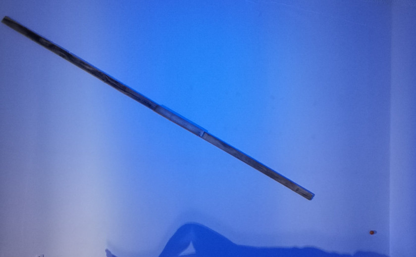 Prostor je po tleh diagonalno presekan z ozkim pasom belega peska. Ta pas se zrcali tudi v leseni kompoziciji na steni, ki predstavlja križ in je fokus trpečega plesa. Plesalka hodi in stoji na pesku kot materializaciji sence križa, ki povzroča čustveno trpljenje. V kotu stoji manjši kamen in tega Lorenci ob koncu predstave zamaje, da ob vedno hitrejšem vibriranju izzveni v tišino. Ob isti steni v drugem kotu pa stoji lesen okvir, ki ga plesalka med predstavo obesi na leseno figuro na steni. Pomen kompozicije in izbiro materialov opiše Lorenci.
