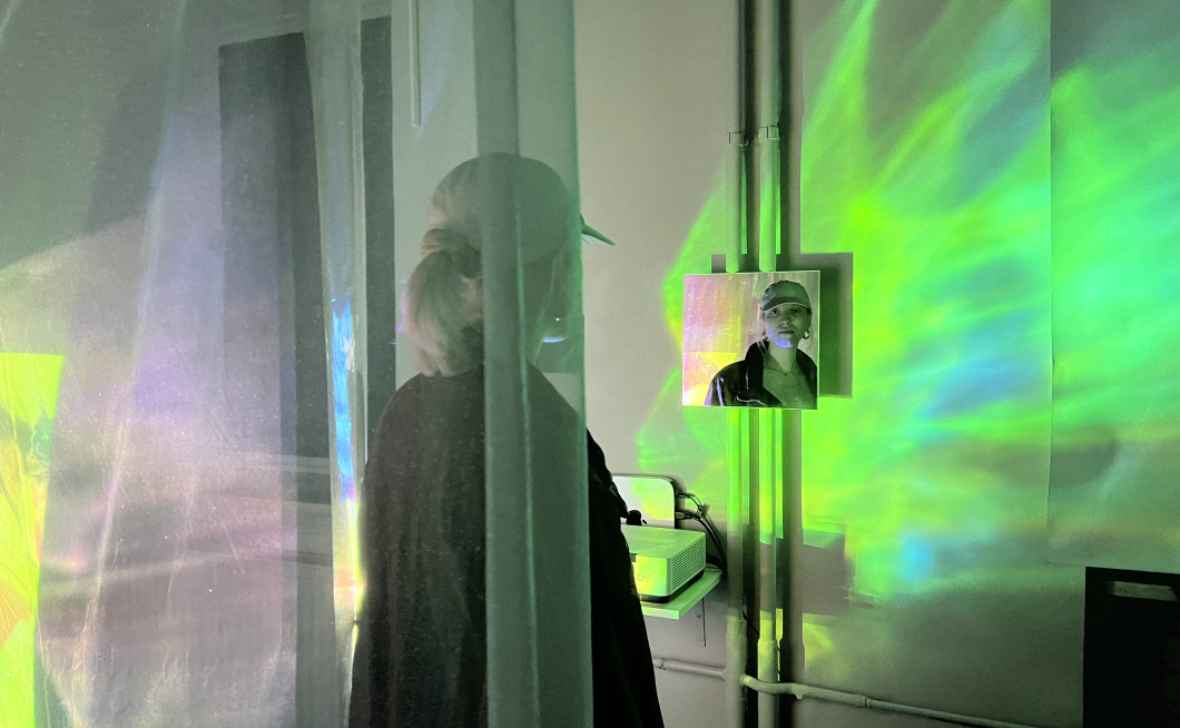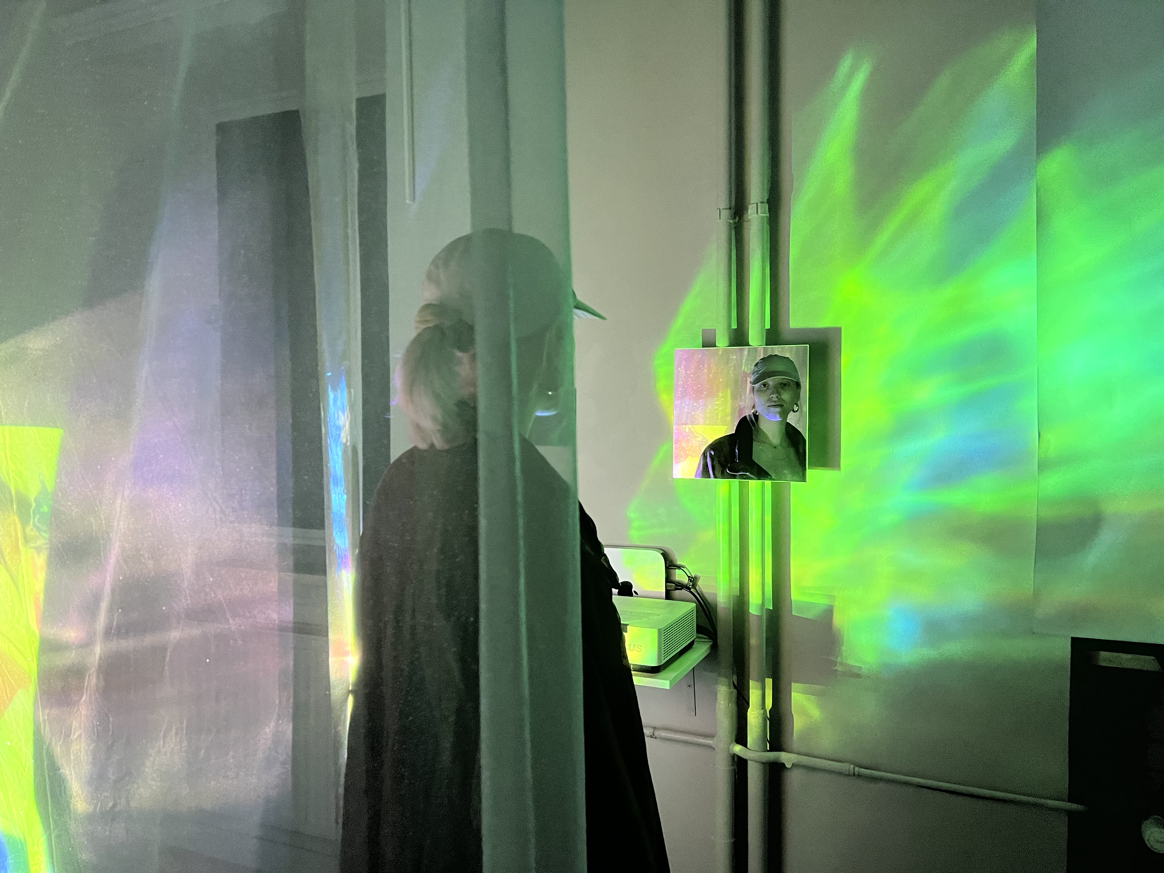 Ko vstopimo v galerijski prostor, se nam preko projekcije na tkaninah, ki visijo s stropa, ves čas predvaja video kolaž. Ta deluje kot samostojen element in bi ga lahko jemali celo kot eksperimentalni film. Foliji, ki prav tako visita s stropa, odsevata različne barve svetlobe, vse skupaj pa se premika zaradi ventilatorja v kotu. Instalacijo dopolnjujejo majhna ogledalca na stenah, ki pod vprašaj postavljajo pojem sebstva, razloži Tomažič.