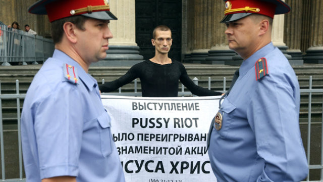 Medtem ko v Rusiji še vedno ugotavljajo, kam je med premeščanjem v drug zapor izginila članica skupine Pussy Riot Nadezhda Tolokonnikov, je izvršna veja oblasti v isti državi poskrbela za presenečenje. Oblasti so namreč včeraj, po enem dnevu, na prostost izpustile performerja Pjotra Pavlenskega, ki se je slekel do golega in si pribil testise na granitno kocko na Rdečem trgu. S tem je želel opozoriti na zatiranje političnih pravic v Rusiji. Izpustili so ga, ker je sodišče odločilo, da policijsko poročilo o dogodku ni ustrezno, saj iz njega ni razvidno, da bi Pavlenski povzročil kaznivo dejanje. Pavlenski si je sicer v preteklosti že protestno zašil usta, tokratni nedeljski protest pa je sovpadal tudi z ruskim dnevom policije.