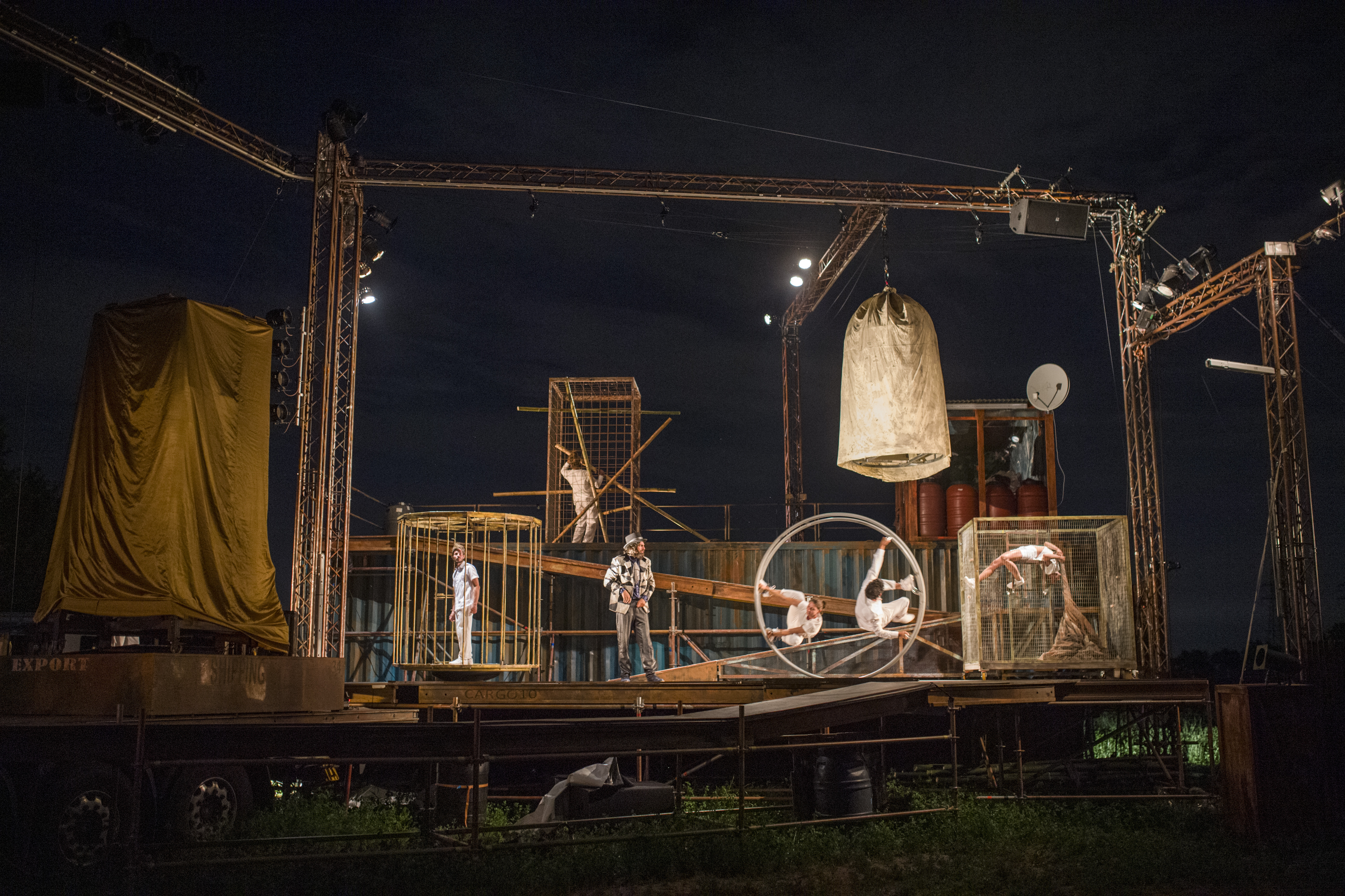 Predstava je tako zapakirana kot velik spektakel, ki se samokritično sprašuje o primernosti svoje senzacionalistične forme za predstavitev teh sicer težkih in morbidnih tem. Na odru, ki je sestavljen iz dveh tovornjakov, ladijskega kontejnerja ter visokih nosil za tehnično in cirkuško opremo, lahko vidimo razne kletke, sode za gorivo ter klančine, ki vodijo akrobate na različne nivoje in višine performativnega prostora. Gibalni in akrobatski elementi so vpleteni v pripoved in akrobati se namesto težkim trikom in prikazovanju viška cirkuških disciplin posvečajo sestavljanju poetičnih slik, ki včasih podkrepijo govorjeno pripoved, včasih pa z izrečenim vzpostavljajo kontrast. Oder se spreminja ‒ od ironičnega prikaza naftnih mahinacij in izkoriščanja delovne sile do resnobnejših prikazov neurij in poplav. Včasih akrobati skačejo čez kotaleče se sode, kar je zelo jasna alegorija Mijamotove legendarne računalniške igre Donkey Kong, včasih pa se podrejajo izkoriščanju lika, ki spominja na mladega Trumpa in nam pove: »I buy, I sell and I do it well.« Uro in pol dolga predstava, ki je ves čas podkrepljena z živo avtorsko glasbo, se po vsem povedanem zaključi s stavkom »Saj je samo cirkuška predstava, ne?« in nas tako po dolgem domišljijskem potovanju spet vrne v realnost.