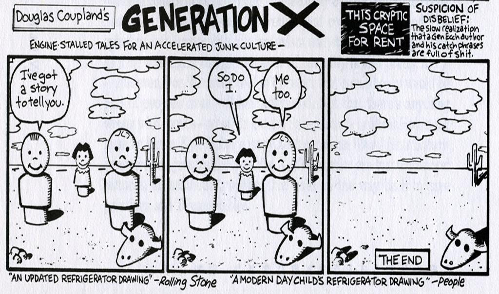 V današnji oddaji govorimo o generacijskem konstruktu Generation X, ki je vrhunec doživel v prvi polovici devetdesetih. Z uporabo primarnega gradiva, si bomo ogledali tiste lastnosti in drže, ki naj bi zaznamovale podobo ljudi, rojenih med letoma 1960 in 1980. Predstavili bomo tudi referenčni okvir, ki olajša delo s temi izmuzljivimi generacijskimi tvorbami, in ki bo tudi prav prišel v naslednji oddaji, ko si bomo ogledali t.i. "millenials", oz. ljudi, rojene med letoma 1980 in 2000.