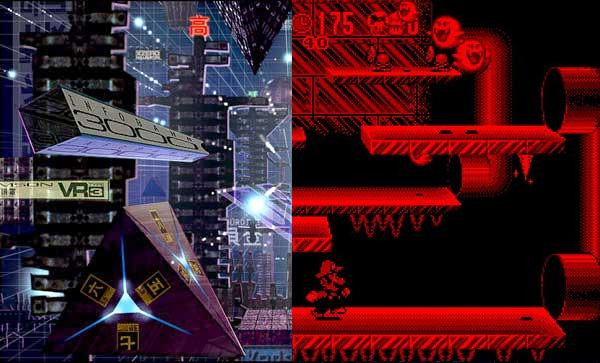 Na sliki: Virtualna resničnost v letu 1995: leva polovica, film Johnny Mnemonic in njegova vizija, desna polovica, Nintendova konzola Virtual Boy in dejansko stanje.