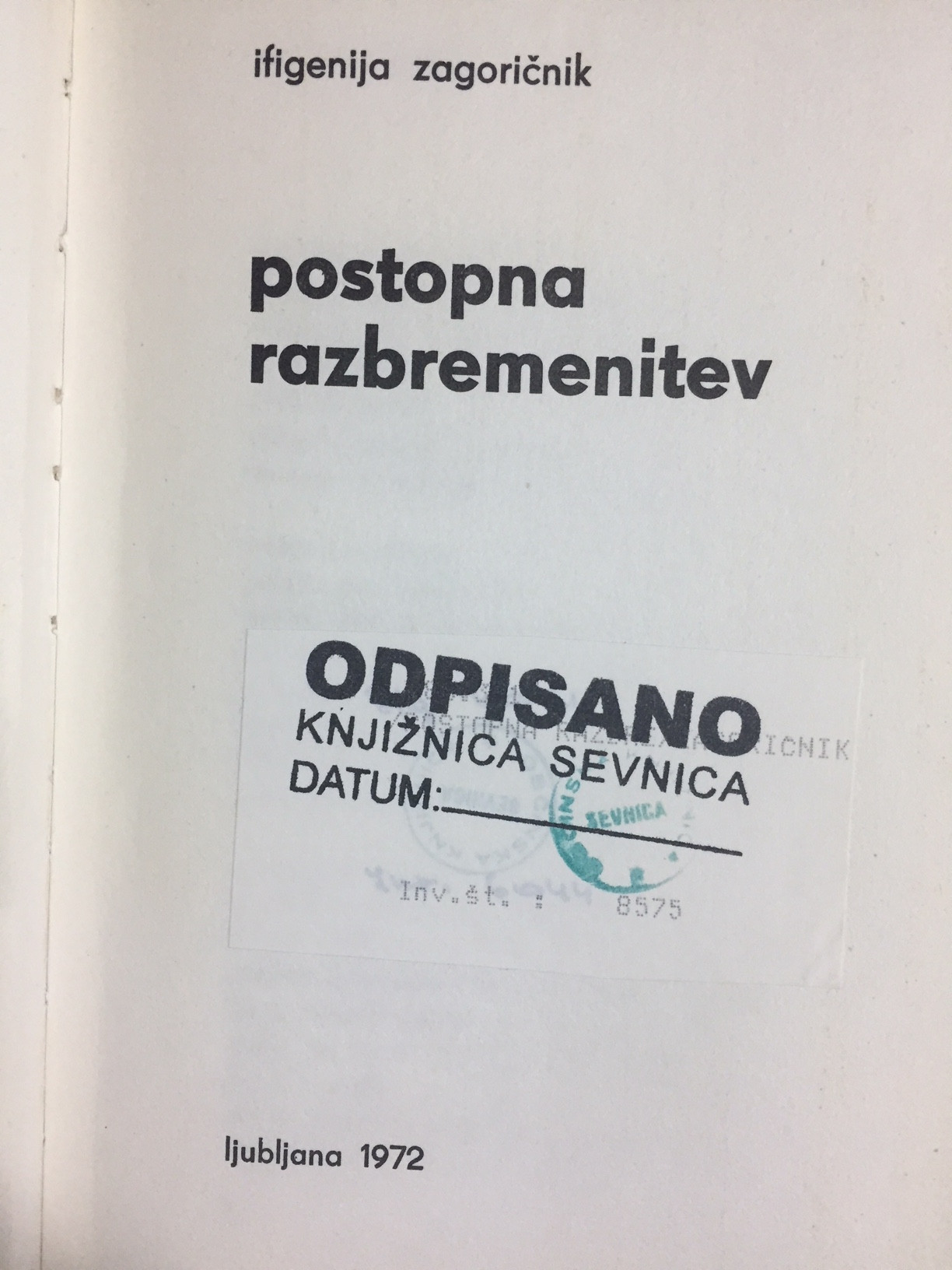 Ifigenija Zagoričnik - Postopna razbremenitev, Mladinska knjiga, 1972