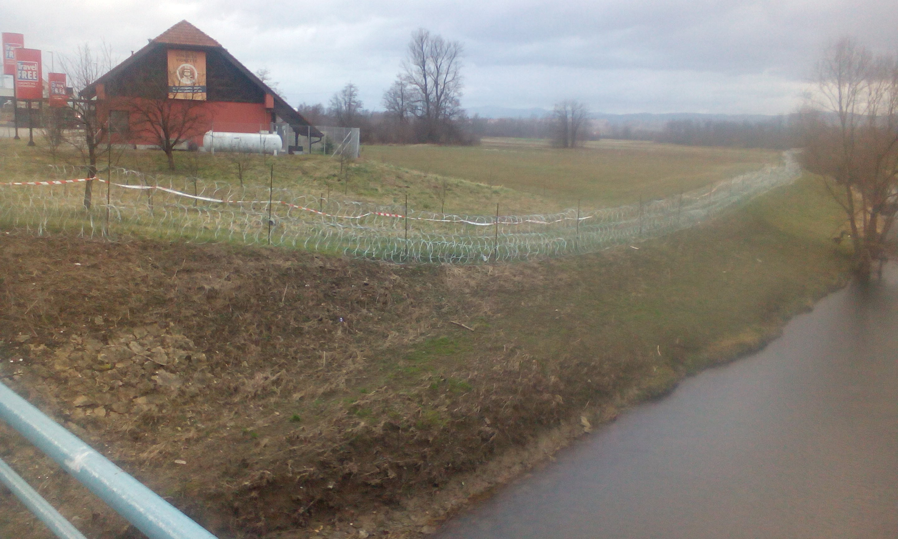 Ni bilo druge, treba je bilo kupiti karto do zadnje postaje. In tako vlak pripelje v Harmico, neposredno pred mejnim prehodom, nato je treba mejo ob sumničavih pogledih policistov prestopiti peš. In potem zakoračiti skozi Rigonce po lokalni cesti v Dobovo, kjer bo prej ali slej prišel slovenski vlak. Pot vodi mimo sprejemnega centra za begunce. Od oktobra se je spremenil in očedil, reorganiziral, dobil visoko ograjo, a pogled se ustavi na bizarnih drogovih z evropsko in slovensko zastavo, ki plapolata nad šotori, pod njima pa je parkiran vojaški džip s posadko. Ko me pot nosi mimo, se ni moč zadržati, da prizora ne bi fotografsko ovekovečil. S telefonom seveda.