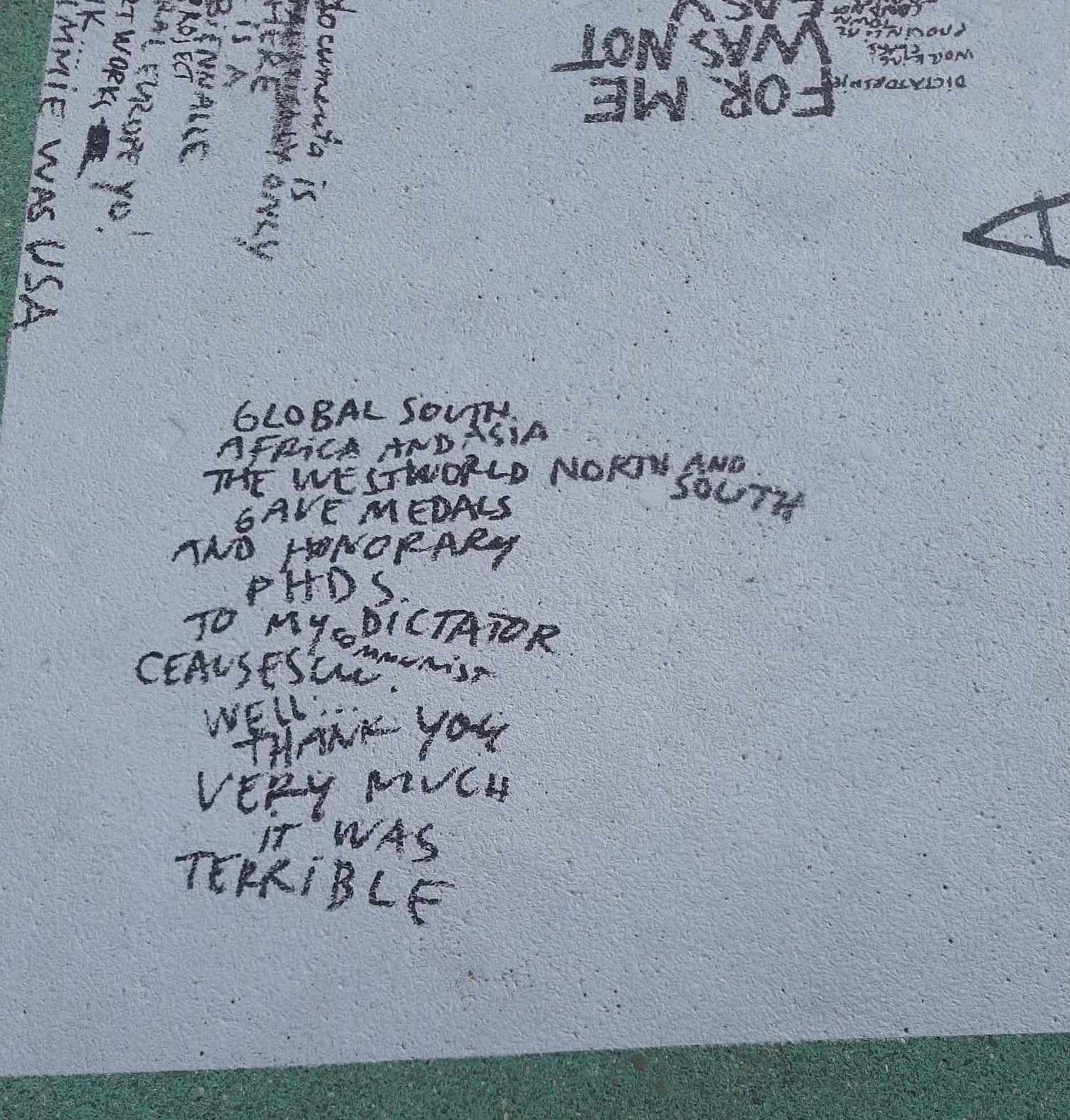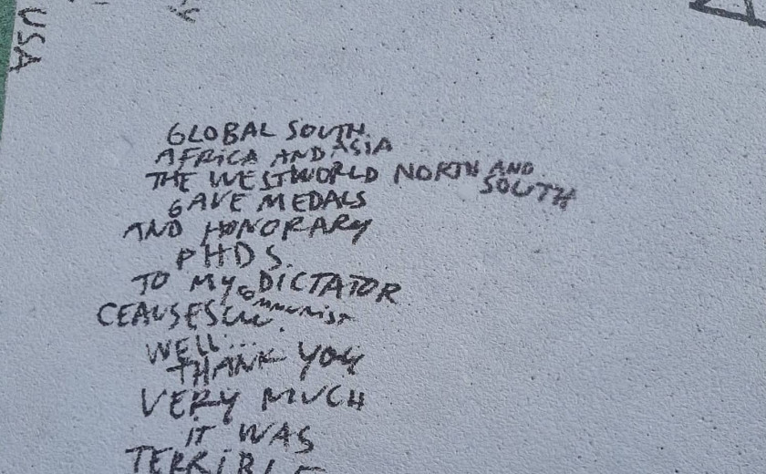 Razpet med Romunijo in svetom Dan Perjovschi ostaja zvest predvsem sebi. Morda je le eden od tisočih umetnikov, ki so prisotni na Documenti, pa vendar izstopa s humorjem in risbo, ki se dopolnjuje in spreminja podobo razstave s časom. Če so ostali klici k protestu in napisi, kot so »Fuck frontex!« ali »Decolonize!«, precej direktno uperjeni proti opresivnim sistemom, se Perjovschi tega loti na bolj prefinjen, humoren način. V eni izmed risb sopostavi napisa »Free disidents!« in »Free the nipple!«, ki ju vihtita dve figuri na protestu. Preberemo lahko tudi, da je srečen, ker lahko sodeluje na zadnji Documenti – mnogi so namreč špekulirali, da naslednje zaradi obtožb antisemitizma in pretirane motnje lokalnim oblastnikom ne bo.