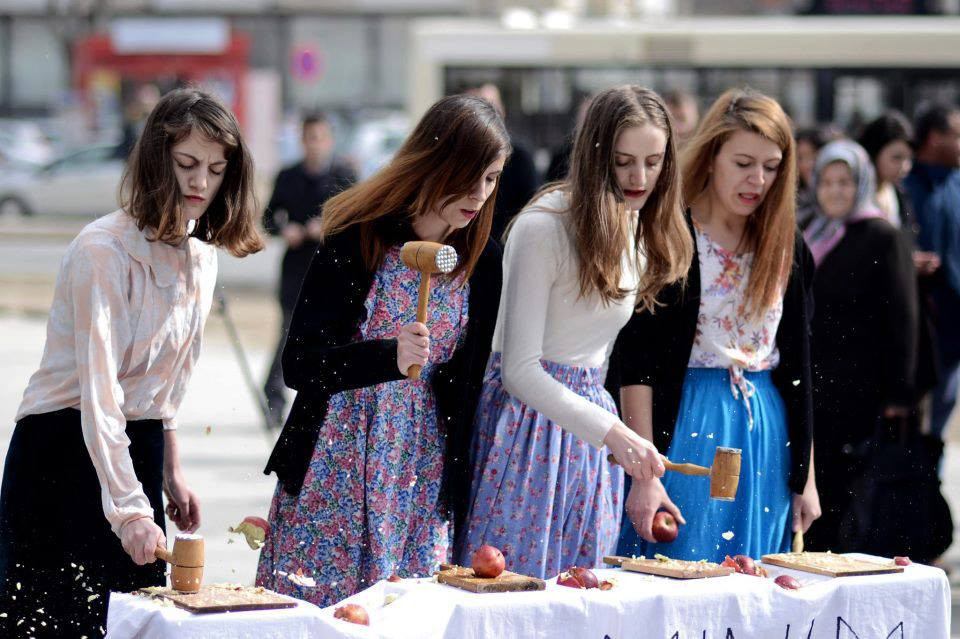 Performans Pregled je potekal med protesti 28. marca letos. Skupina Haveit je pred parlament postavila pogrnjeno mizo z napisom »Ekzaminim« in zahtevo po ginekološkem pregledu uprizorila s kladivi za meso. Z njimi so udrihale po jabolkih. Ko so se kladiva zlomila, so še naprej udrihale. Če se sprašujete, zakaj ravno jabolka: v albanski folklori je jabolko pogosta metafora za žensko lepoto.