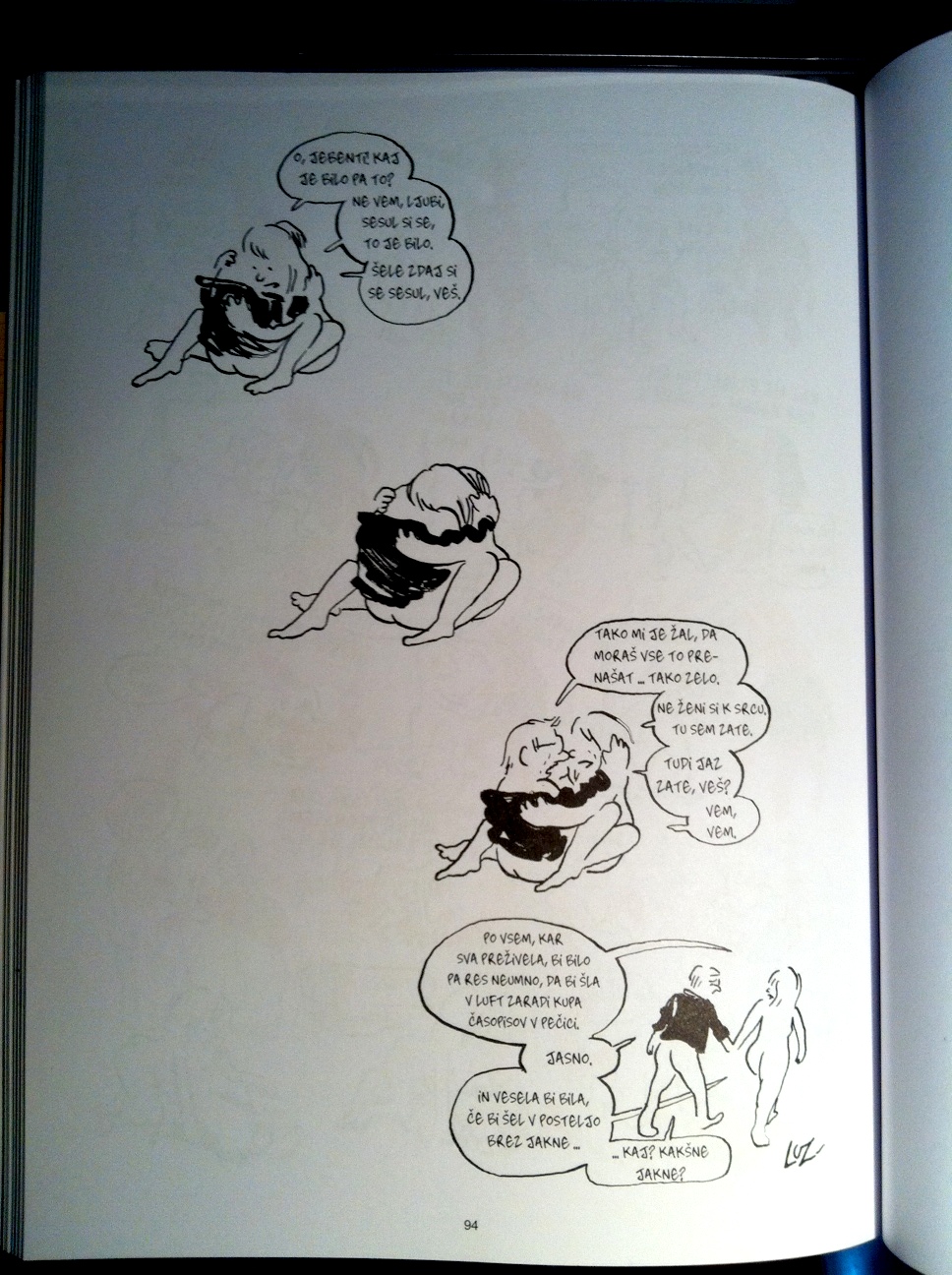 Avtorjev risarski genij se kaže predvsem v načinu, kako uspeva narisati oziroma prenesti emocijo. Njegova risba je karikaturno enostavna, jasna in prečiščena tako, da je občasna uporaba barve močno orodje, s katerim prikaže emocijo. Primer tega je poglavje, v katerem skozi odprta vrata kopalnice posluša ženo, ki ima skorajda monolog. On pa svoj fokus z računalniškega ekrana z barvo prenaša naokrog, dokler ta ne zavzame celotnega kadra. Bralca mu tako enkratno uspe vsesati v atmosfero momenta, da se vsi trije skupaj, z ženo in avtorjem vred, v zadnjem kadru – zdramimo. Pak! Kot bi počil milni mehur. Tovrstno mojstrstvo je težko opisati, a za vse, ki se učijo podajanja zgodbe skozi tekst in risbo, je Luz lahko velik učitelj.