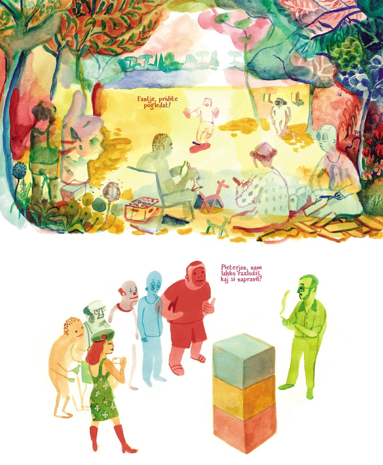 Avtor ne le, da ne uporablja govornih oblačkov, ne uporablja niti kvadratkov, v katere bi zamejil posamezne kadre. Raje se loteva manjših sličic, na katerih upodobi le lik ali dva, ali kar kičastih celostranskih ali dvostranskih podrobnih ilustracij. Te po svoje spominjajo na žive in podrobnosti polne risbe Ančke Gošnik Godec, ki je na podoben način narisala ilustracije za rezijansko pravljico Tri botre lisičice. Še najbolj se razlikujeta po tem, da je ilustratorka pri procesu uporabljala pritajene, jesenske barve, Evens pa žive barve strupenih kombinacij. Ponavadi le po dve do tri različne barve na stran, ki jih le delno niansira.