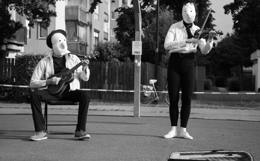 V delu v nastajanju Duo terasa sta Alenka Marinič in Justin Durel želela raziskati performativni potencial larvalnih mask, ki so sicer del študija tehnike fizičnega gledališča. Z maskami se performerji učijo izražati čustvena stanja in želje likov zgolj s telesnim izrazom - maska je kot lutka, ki jo igralec nosi na glavi. Larvalne maske, ki so izpeljane iz baselskih karnevalskih mask, še najbolj spominjajo na modernistične skice ali animirane filme zagrebške šole 50. in 60. let prejšnjega stoletja: iz abstraktne bele gmote lahko razberemo nos in dve luknji za oči, lik pa je reduciran na eno samo značajsko lastnost. Pred publiko prištorkljata dva lika v stiliziranih črno-belih kostumih - hitra in malce nervozna violinistka ter lenobni ostareli kitarist - in z omejenimi glasbenimi veščinami odšpilata tri komade. Pravzaprav se ne zgodi nič. Vseeno kot hipnotizirani opazujemo njuno okorno muziciranje, hecne tike, poglede in premore. Dobimo občutek, da smo padli v strip ali risanko dveh na hitro skiciranih modernističnih pojav. Neoprijemljivost dogajanja skupaj z dosledno utelesitvijo kreatur ustvari bizarni fiktivni svet, v katerega nam je dano pokukati za deset minut in v katerega bi nemara lahko bolščali še dlje. Po predstavi so se v pogovoru z avtorjema odprle različne možnosti nadaljnjega razvoja performativnega potenciala larvalnih mask, recimo poudariti kontrast med likoma, iz katerega se lahko porodijo konflikti in zgodba, ali pa poudariti interakcijo in omogočiti občinstvu vstop v drugo resničnost.
