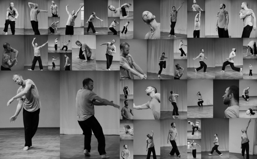 Nekateri deli so čisti Steve z mehkimi gibi in nenadnimi preobrati, ki jih zaznavam čez svojo hrbtenico. Ponekod je Konjar namenoma štorast. Hodi po petah. Pusti telesu, da pade na tla. Ko iščem vstop v posamezni prizor ali sekvenco, počnem to, kar je počel Konjar ob gledanju Paxtona, torej: ugotavljam, kaj žene plesalca v vsakem trenutku. Včasih vstopa v prizor ne ponudi spremljanje telesa, ampak poslušanje glasbe. Tako Konjar eno variacijo začne s karikiranim oponašanjem baročnih dvorskih plesov. Spet drugič glasba ni pomembna in se plesno telo ukvarja s svojo težo. V tretjem trenutku opazim okna dvorane in kako se ples povezuje z drevesom na dvorišču. Ali pa Jurijevo telo le leži na tleh. Diha. Tok plesa ima svojo logiko in Konjarjeva metoda je dopuščati, da ta stopi v telo.