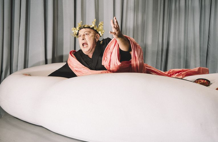 Na odru stoji zbor, ki z glasbili in petjem spremlja dogajanje. Pred njim protagonist, v improvizirani togi in z zlato lovoriko na glavi, nekaj zabrenka na liro. Ne, nismo v antičnem amfiteatru, temveč v ljubljanskem Mladinskem gledališču; tu si ogledujemo predstavo Pojedina pri Trimalhionu, ki je bila premierno uprizorjena 27. decembra lani. V njej režiserka Bojana Lazić odlomek antičnega romana Satirikon uporabi kot odskočno desko za refleksijo sodobnega gledališča in dinamik moči med njegovimi ustvarjalci.