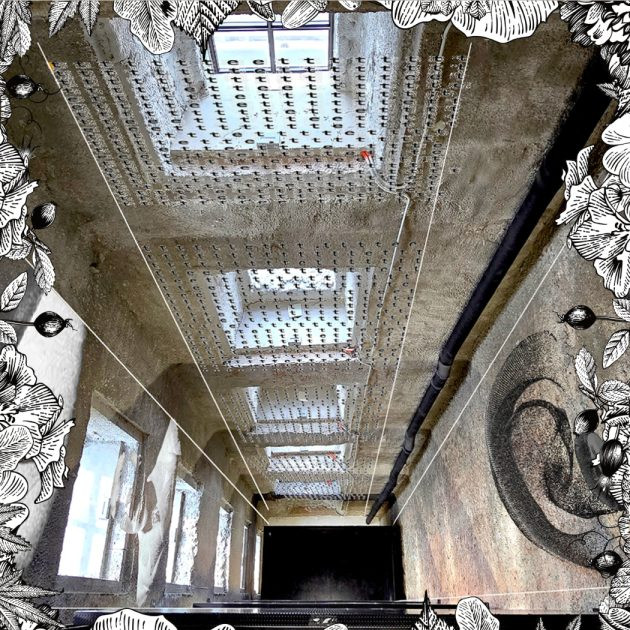 Kot redno obiskovalko Cukrarne me sprva preseneti sámo prizorišče zvočnega sprehoda – obiskovalci smo povabljeni na stopnice. Ne kričeče rdeče stopnice v osrčju galerije, pač pa požarne stopnice v njenem vogalu. Turobne, odmevajoče, doneče in na videz brezkončne se od kleti raztezajo do vrhnje etaže razstavnih prostorov. Obdajajo jih zidovi Cukrarne, a ne taki, kot jih je vajen obiskovalec razstav. Grób, neobdelan zid in vanj vdelana, na gosto posejana okna dajejo prostoren, a hkrati utesnjujoč, moreč občutek. Nasprotje modernosti podaja občutke neumeščene nostalgije, hkrati pa robata tekstura in rigorozni ritem stavbnih elementov v spomin prikličejo vojašnico. So bili to zidovi Cukrarne, nudeči zavetje literatom slovenske moderne?