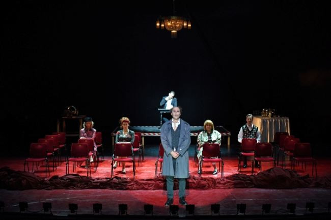 Kaj točno mislimo s tem? Če v besedilu kar mrgoli referenc na gledališki kontekst uprizoritve – Nemška hiša, Mala drama, Hedda Gabler, Levi oder – pa že začetni prizor razkrije raven komičnosti, ki v besedilu ni mogoča. Ko Janez Škof kot Valentin skozi avditorij stopi na oder in z njega nekaj časa zre v publiko, dokler se zagrnjena zavesa izza njega ne zruši na tla, to niti ni tako komično kot to, kar razgaljeni oder razkrije v svoji globini. Tam se namreč ne nahaja nič drugega kot scenografija Branka Hojnika iz predstave Kralj Ubu [ibi], Jurij Zrnec pa kot gledališki direktor Oto z ubujevskega odra začne odganjati Valentina z gledališke rampe. Gledališki direktor kot kralj Ubu, a čigav portret se tokrat skriva na pokritem platnu?