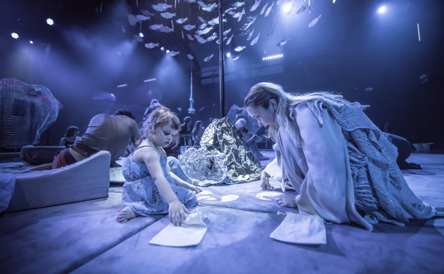 Interaktivna predstava Slišati morje je vzniknila pod taktirko avtorice in režiserke Saške Rakef. Namesto na sedeže dvorane smo povabljeni, da se bosi pridružimo igralki Maji Kunšič na morski jasi. Pod pridušenimi lučmi stopamo do mehke jase. Nad nami se v krogu počasi vrti jata rib in če prisluhnemo, že slišimo morje. Vsi ti elementi soustvarjajo pomirjujoče vzdušje in občutek varnosti.
