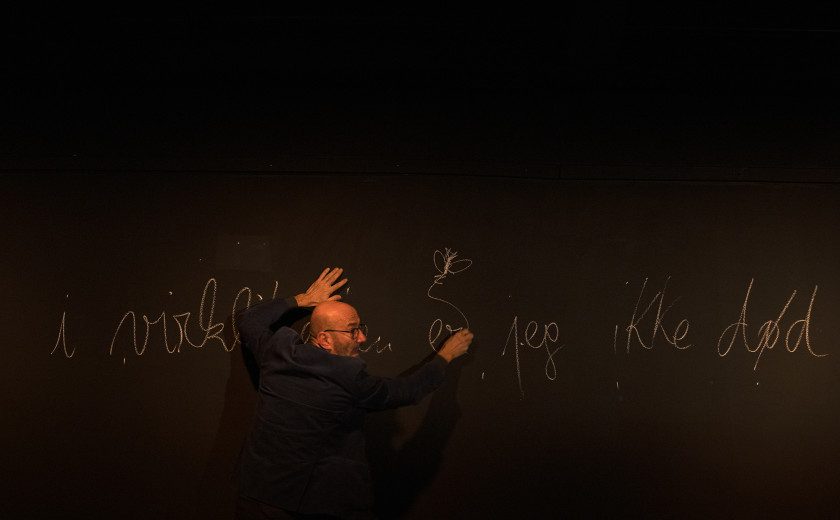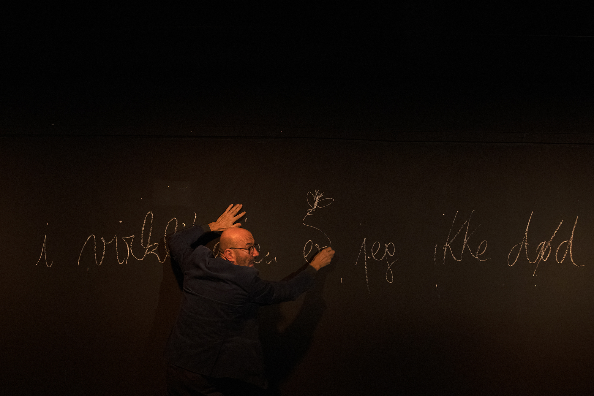 Ravno prepletenost belih sledov krede ali smrti in stetoskopa ali življenja ponazarja položaj avtorja monodrame. Niklas Rådström je dramski monolog Smrtno resno namreč napisal po tem, ko je bil zaradi diagnoze levkemije soočen z lastno minljivostjo. Tudi Boris Ostan poskuša pri občinstvu zbuditi zavest o minljivosti in zato vsakih nekaj minut zrecitira odlomek iz kakšnega srednješolskega učbenika biologije ali slavospev požrtvovalnosti zdravniške stroke, ki si kruh služi z ohranjanjem srčnega utripa svojih pacientov. Bele sledi krede na črnih zidovih ‒ opomin na smrt ‒ naenkrat pospremijo vsako misel; od fascinantne hitrosti spermijev in celične delitve do bolestnega strahu pred smrtjo Hansa Christiana Andersena, ki je imel na nočni omarici vedno sporočilo, da ni mrtev, da zgolj spi.